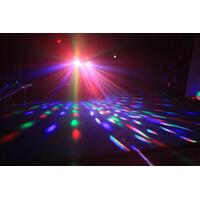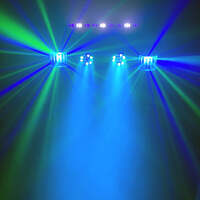 The 2 LED RGBW PAR spotlights function as spotlights and illuminate the stage or dance floor in color. The two RGBW derby effect disco light onto the dance floor or on the wall, and a combined UV / stroboscope bar produces black light and flashes.