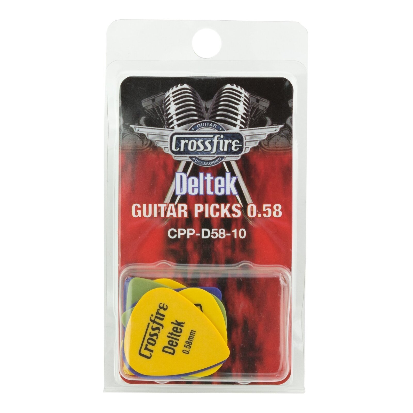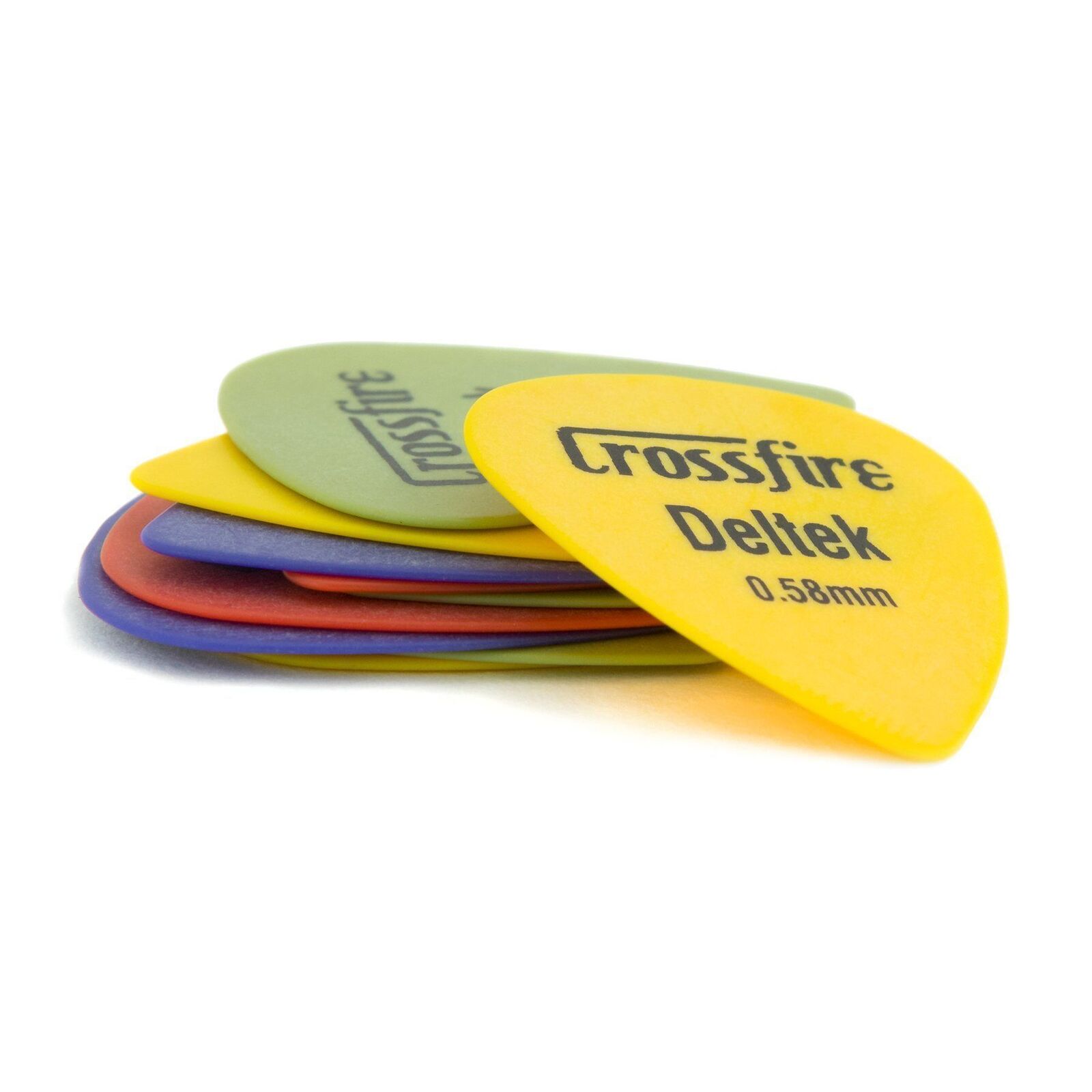 Pack contains ten high quality assorted colour Crossfire Deltek 0.58mm (light) guitar picks featuring improved grip coating.