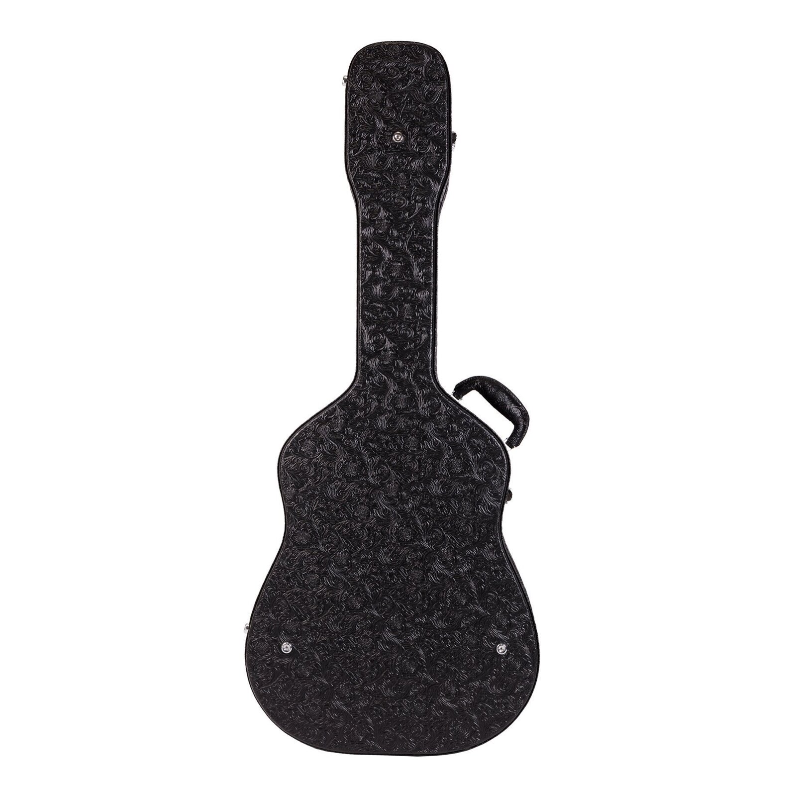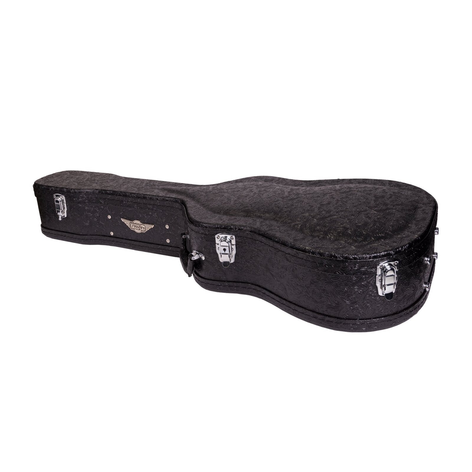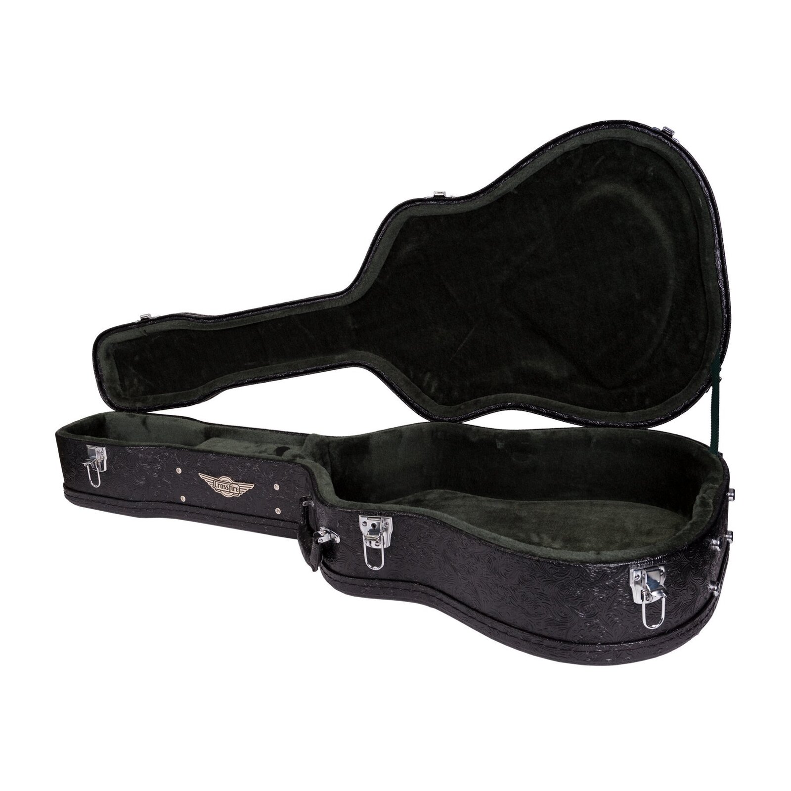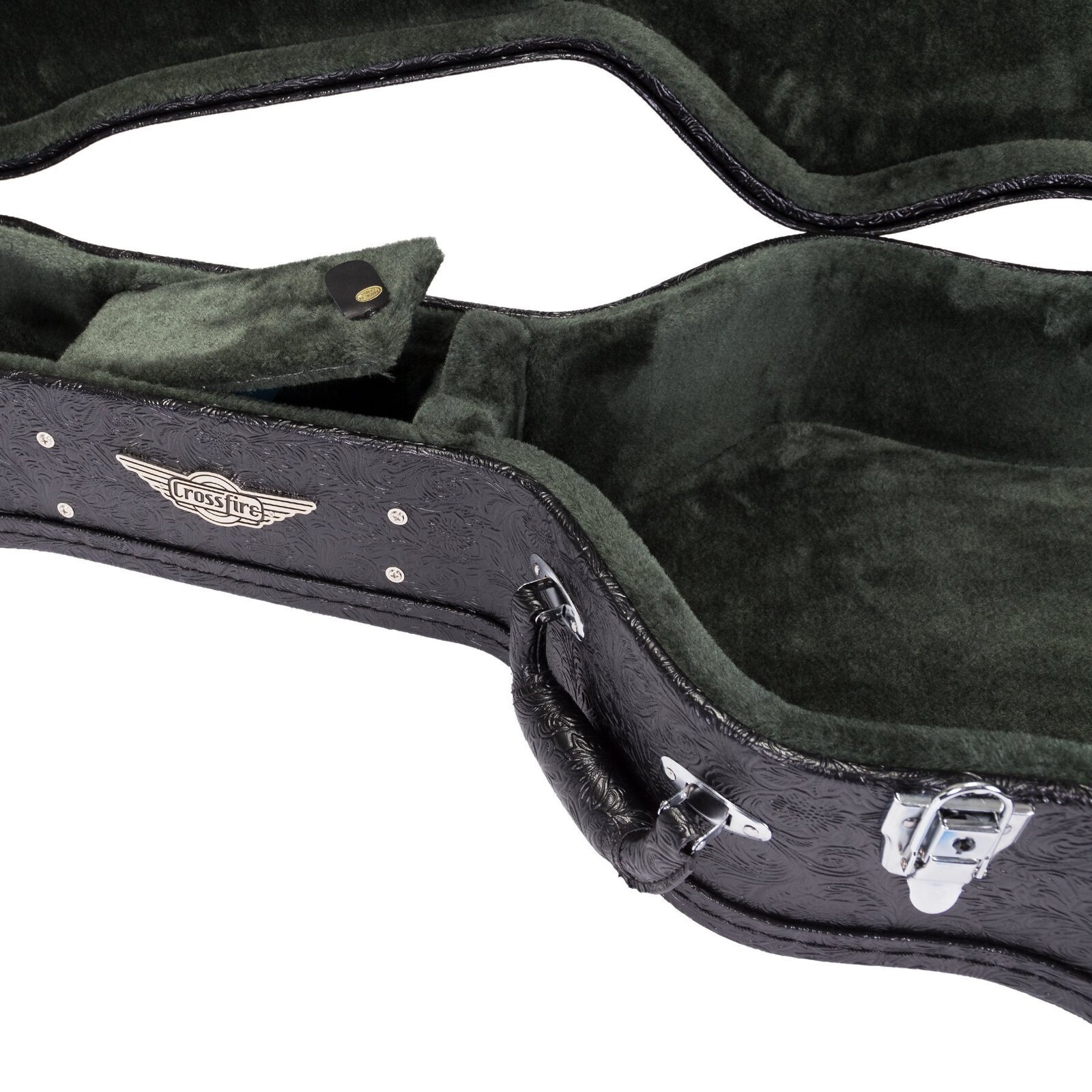 Travel in style while keeping your musical investment secure with the Crossfire deluxe shaped 12 string acoustic guitar case. Features heavy duty plywood construction with impact resistant reinforced arched top, paisley patterned black vinyl exterior covering, dark forest-green plush padded interior, deluxe padded carry handle, accessories compartment, metal feet on base and back, as well as chrome latches (central latch is lockable).