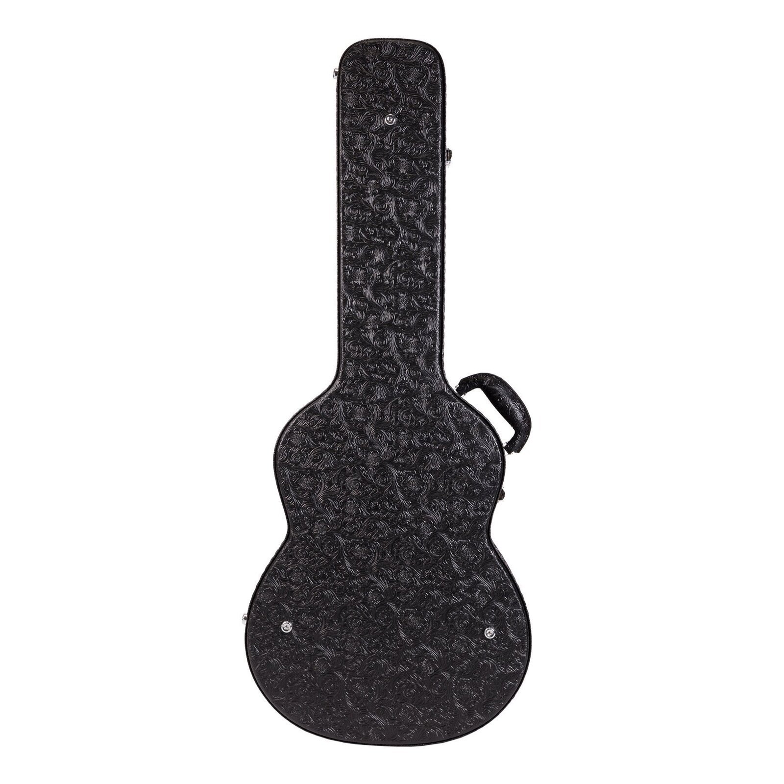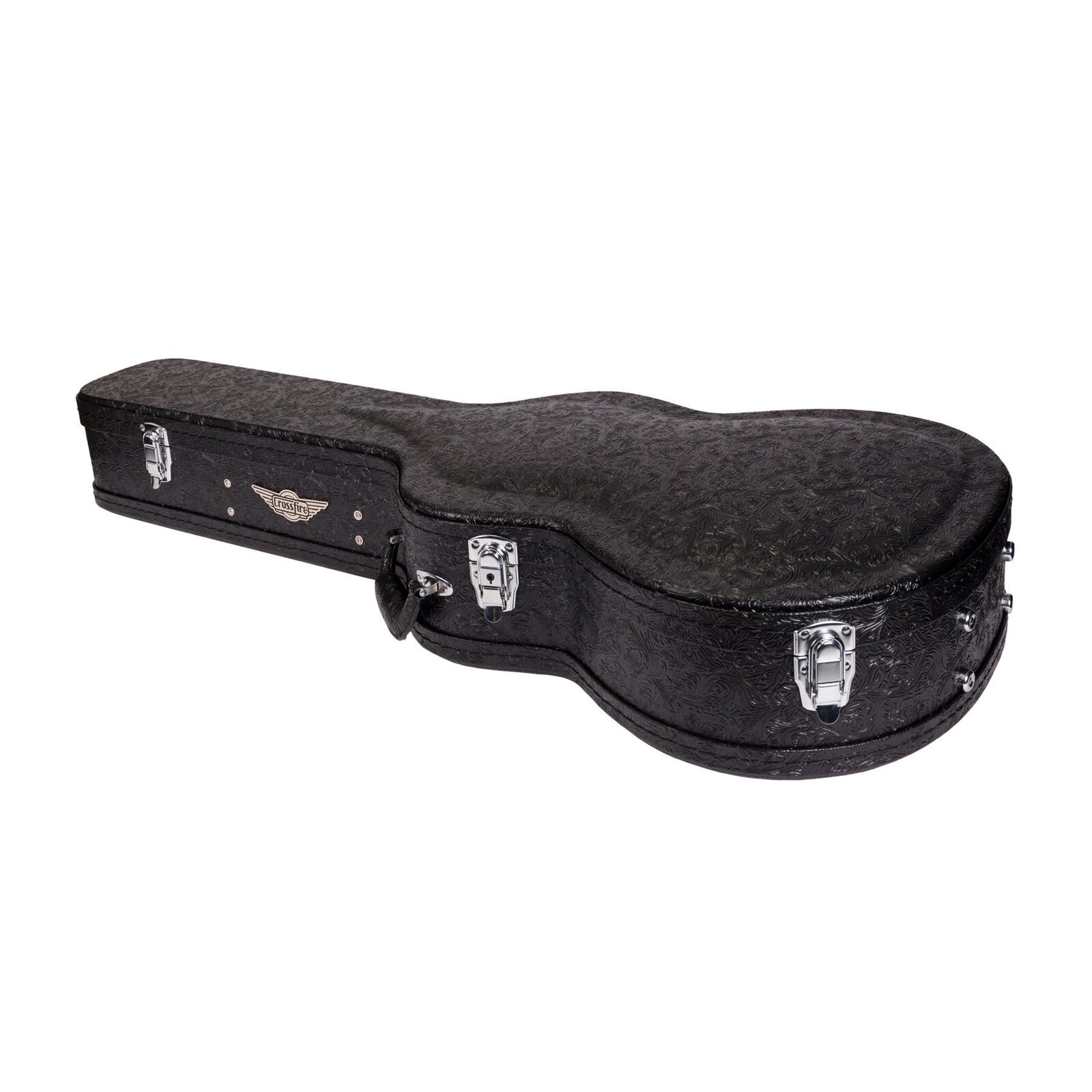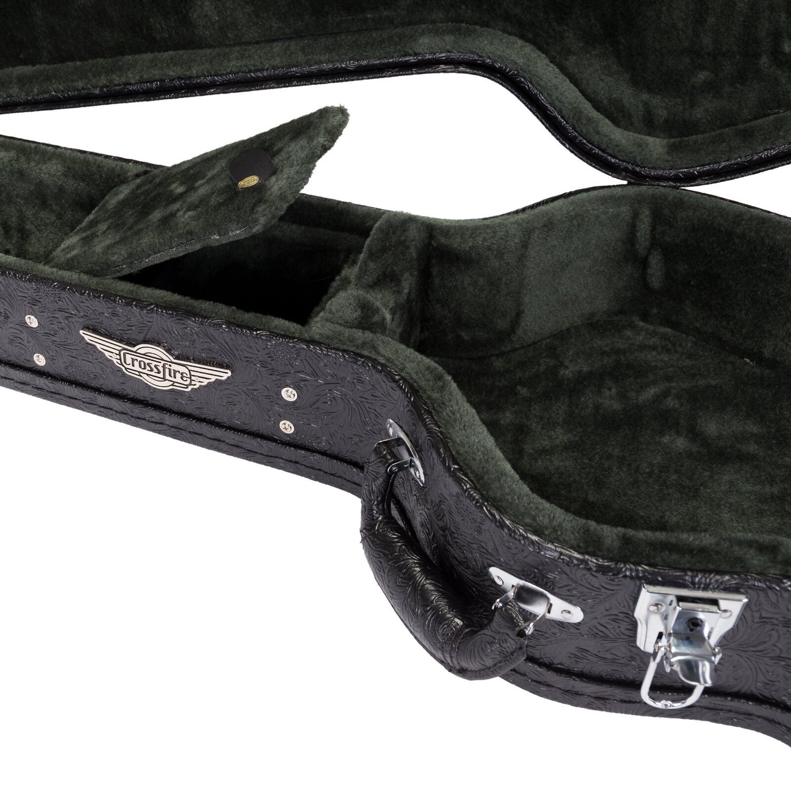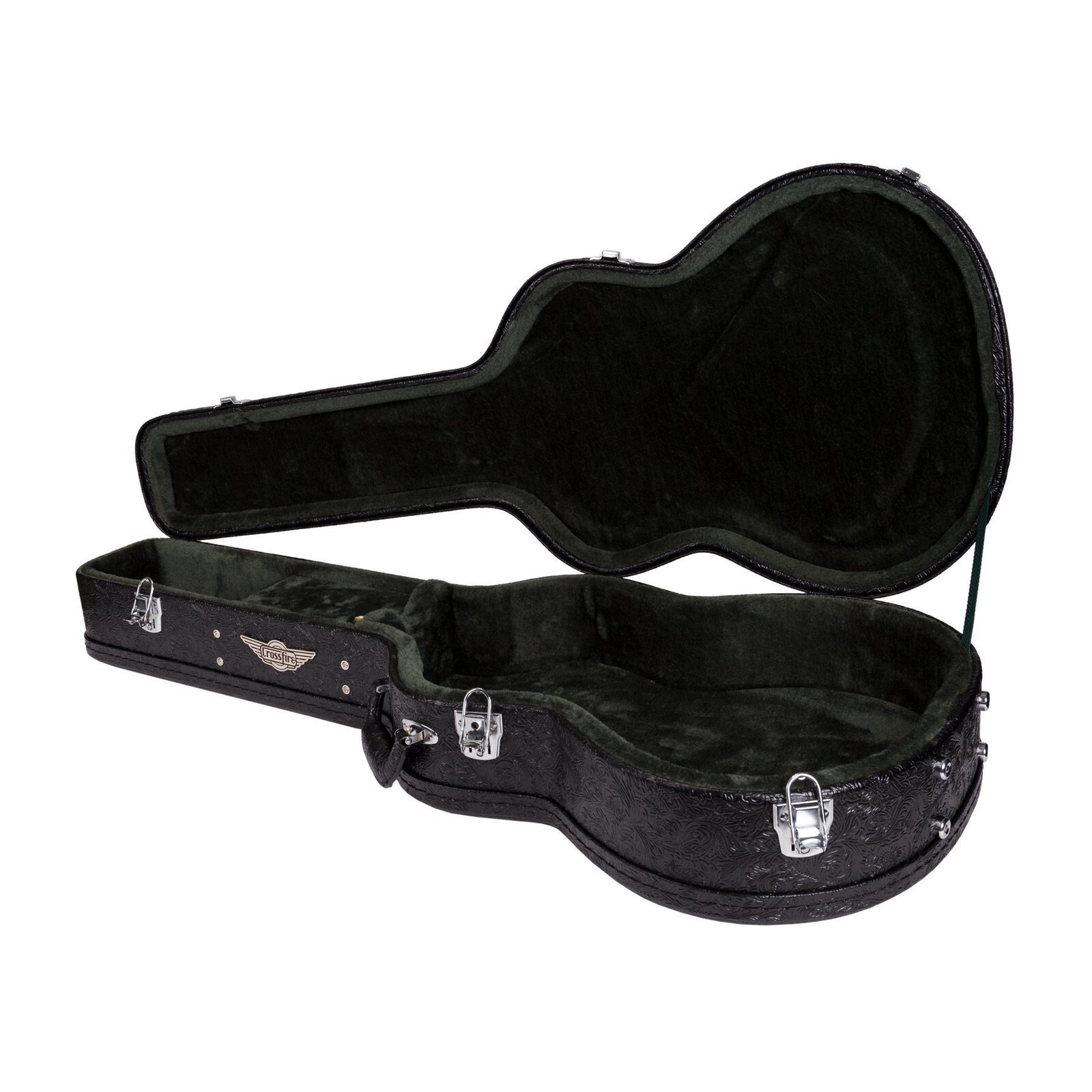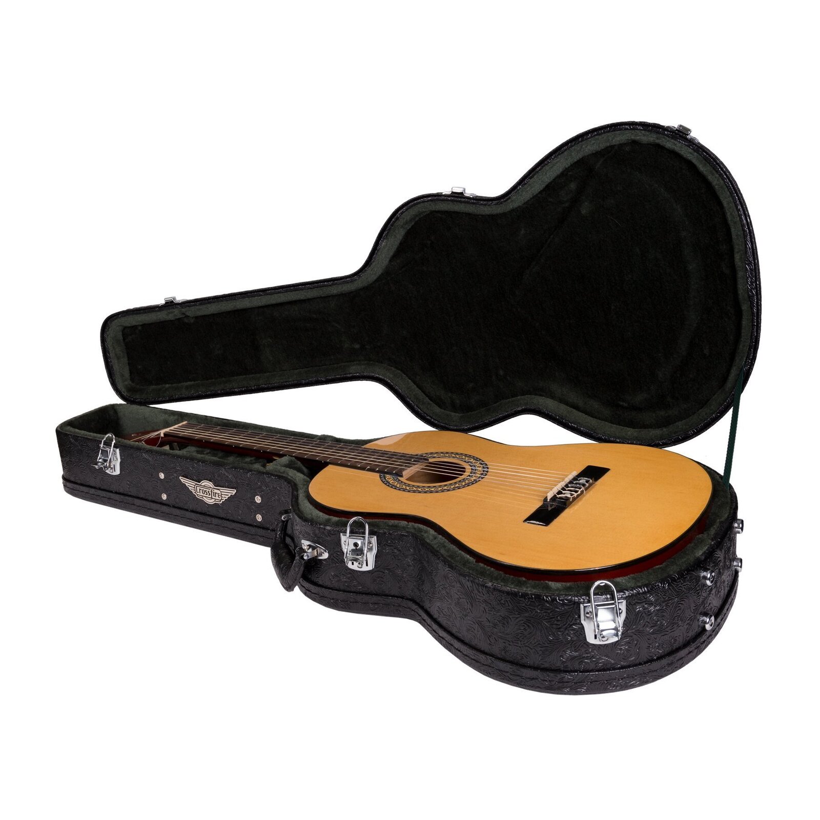 Travel in style while keeping your musical investment secure with the Crossfire deluxe shaped classical guitar case. Features heavy duty plywood construction with impact resistant reinforced arched top, paisley patterned black vinyl exterior covering, dark forest-green plush padded interior, deluxe padded carry handle, accessories compartment, metal feet on base and back, as well as chrome latches (central latch is lockable).