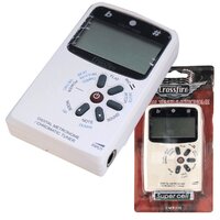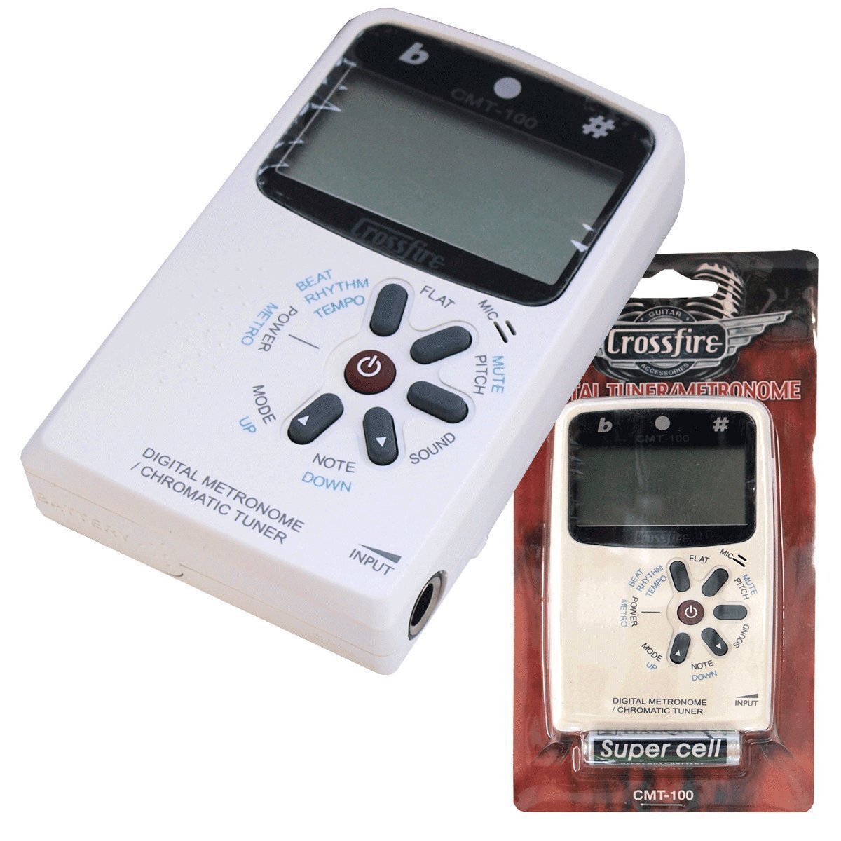 This is our popular Crossfire CMT-100-WHT Digital Metronome and Chromatic Tuner. Suitable for Acoustic, Electric and Bass Guitar tuning using either the plug-in socket or built-in microphone. Powered by two ‘AAA’ batteries (included).