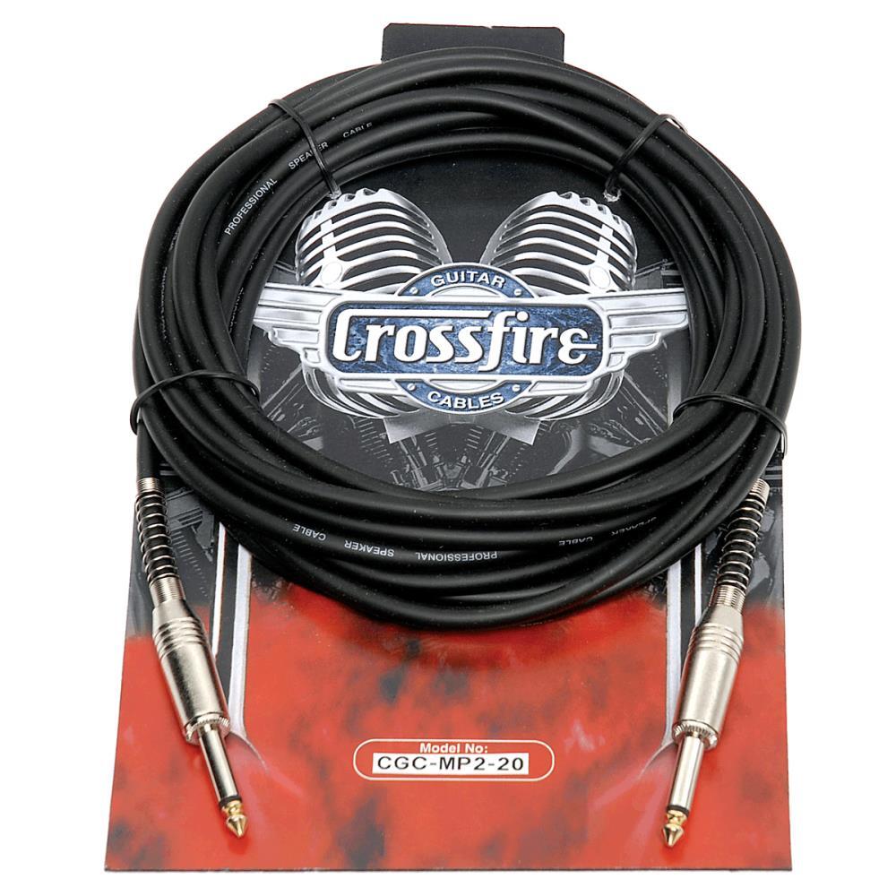 The Crossfire CGC-MP2-20 Guitar / Instrument Cable is a low-noise, 20 foot black cable with heavy-duty Satin Chrome straight jacks with Gold-plated tips.