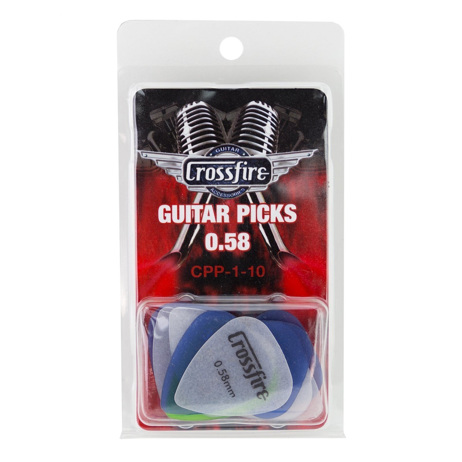 Pack contains ten high quality assorted colour Crossfire 0.58mm (light) guitar picks.