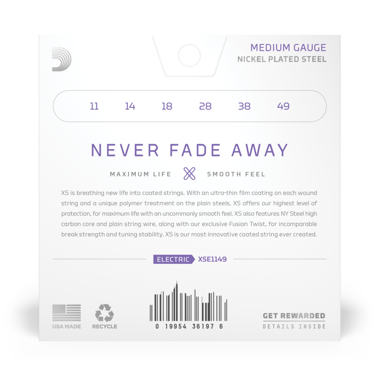 XS Nickel coated electric guitar strings provide the longest life of any DAddario electric guitar string. Coated with our groundbreaking XS coating, these premium electric strings attain maximum life and a smooth, fast feel without dampening their outstanding tone. Constructed with a NY Steel core, reformulated nickel-plated steel wrap wire, and Fusion Twist technology, XS Nickel strings boast superior strength and tuning stability, plus richer harmonics, greater clarity, and remarkable definition with every sweep, slide, and bend. This 11-49 Medium gauge set provides increased volume, with slightly more tension and resistance.XS is breathing new life into coated strings. With its ultra-thin film coating on every wound string and unique polymer treatment on the plain steels, XS offers our highest level of protection for maximum life with an uncommonly smooth feel. XS also features NY Steel high carbon core and plain string wire, along with our exclusive Fusion Twist, for incomparable break strength and tuning stability. XS is the most innovative coated string ever created.