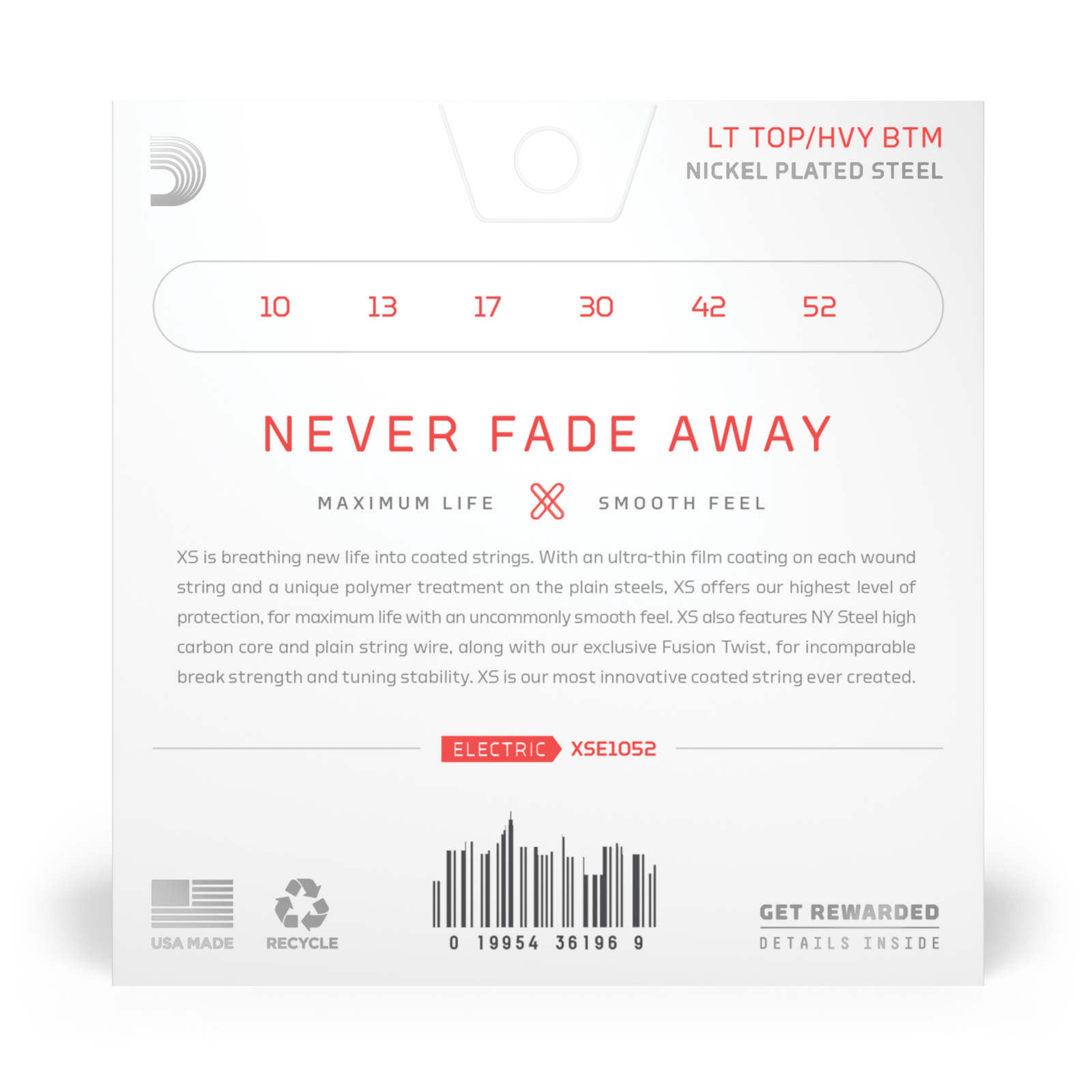XS Nickel coated electric guitar strings provide the longest life of any DAddario electric guitar string. Coated with our groundbreaking XS coating, these premium electric strings attain maximum life and a smooth, fast feel without dampening their outstanding tone. Constructed with a NY Steel core, reformulated nickel-plated steel wrap wire, and Fusion Twist technology, XS Nickel strings boast superior strength and tuning stability, plus richer harmonics, greater clarity, and remarkable definition with every sweep, slide, and bend. This 10-52 Light Top/Heavy Bottom gauge set has a deeper low-end than Regular Lights, balanced with comfortable playability.XS is breathing new life into coated strings. With its ultra-thin film coating on every wound string and unique polymer treatment on the plain steels, XS offers our highest level of protection for maximum life with an uncommonly smooth feel. XS also features NY Steel high carbon core and plain string wire, along with our exclusive Fusion Twist, for incomparable break strength and tuning stability. XS is the most innovative coated string ever created.