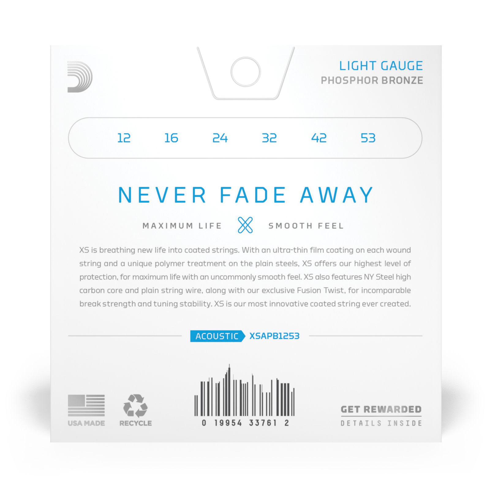 Born from our greatest breakthrough in string innovation, XS Phosphor Bronze strings have the longest life of any DAddario acoustic guitar string. The XS coating gives our warm, balanced phosphor bronze strings maximum life, with an uncommonly smooth feel. Made with a NY Steel core, phosphor bronze wrap wire, and Fusion Twist technology, XS coated acoustic guitar strings have incomparable break strength and tuning stability, in addition to their dramatically increased lifespan. 12-53 Light strings are our most popular acoustic gauge, providing a nice balance of playability and tone.
