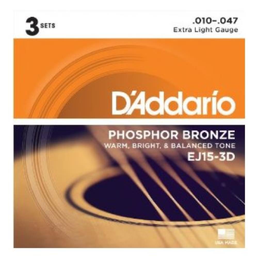 D'Addario EJ15-3D Phosphor Bronze Acoustic Guitar Strings, Extra Light, 3 Sets