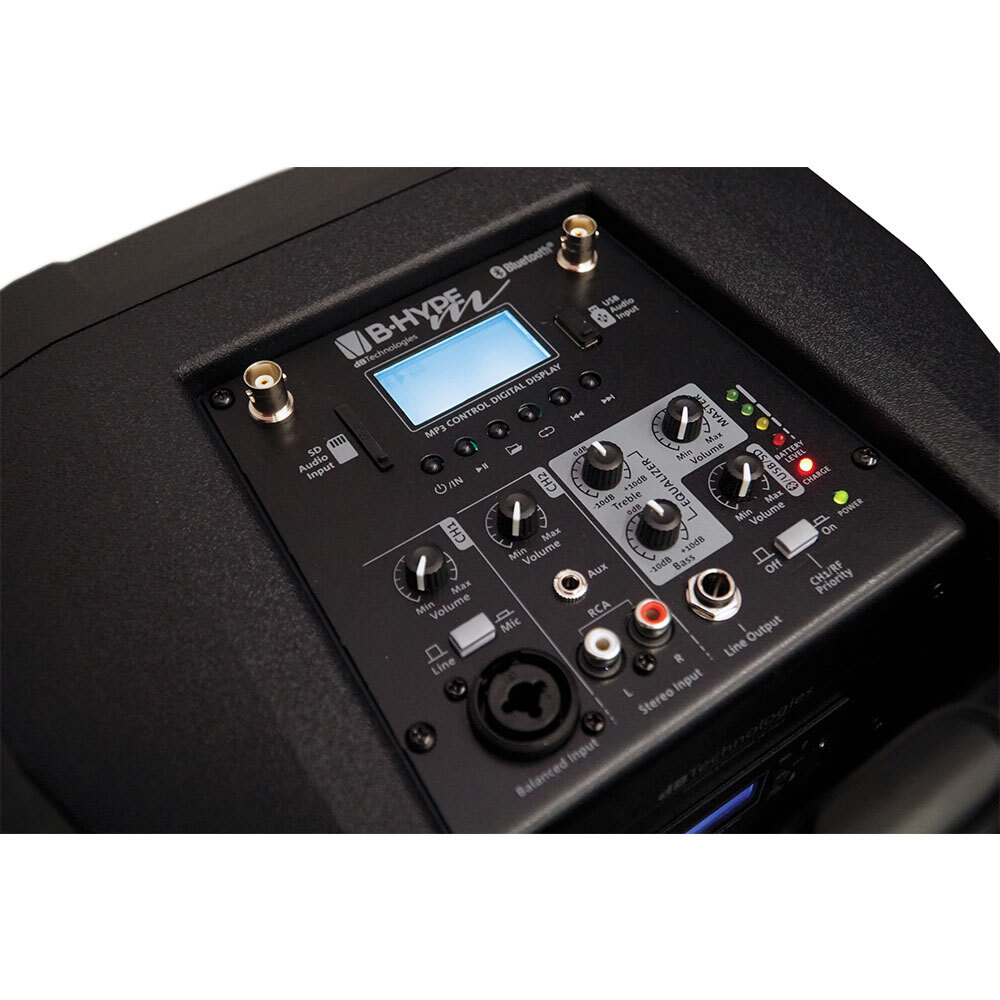 B-Hype M mixes the professional acoustic performance of the BH family with the most advanced versatileness of a complete portable PA equipped with a wireless microphone system, audio media player with Bluetooth connection, SD card and USB port, a long lasting battery, wheels and a retractable top handle: all you need for a professional performance on the move.