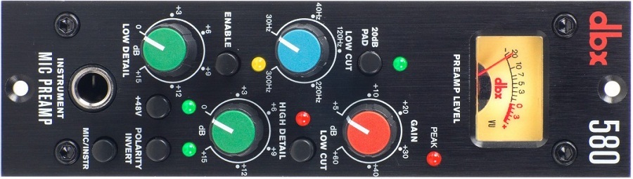 With its modular 500 Series design, the dbx 580 delivers up to 60dB of gain, features a variable-frequency Low-Cut Filter and unique Low and High Detail Equalization Controls, a 20dB Pad, Polarity Invert, +48V Phantom Power, a Front Panel Instrument Input, VU Metering and Peak Indicator.