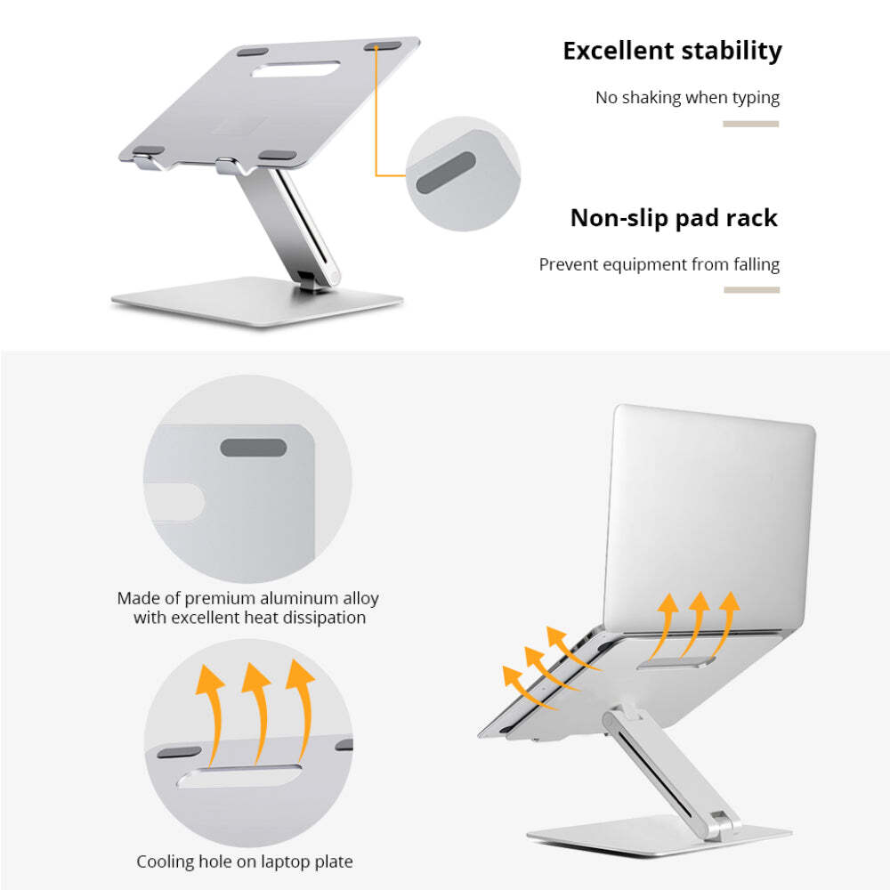 - û§FOLDABLE & HEAT DISSIPATION: Unfold to adjust the height of the laptop stand from 1.38" to 8.25", laptop tray can tilt to get your comfortable viewing angle. The hole design aligns with the position of the notebook cooling vent, decreasing the risk of overheating.