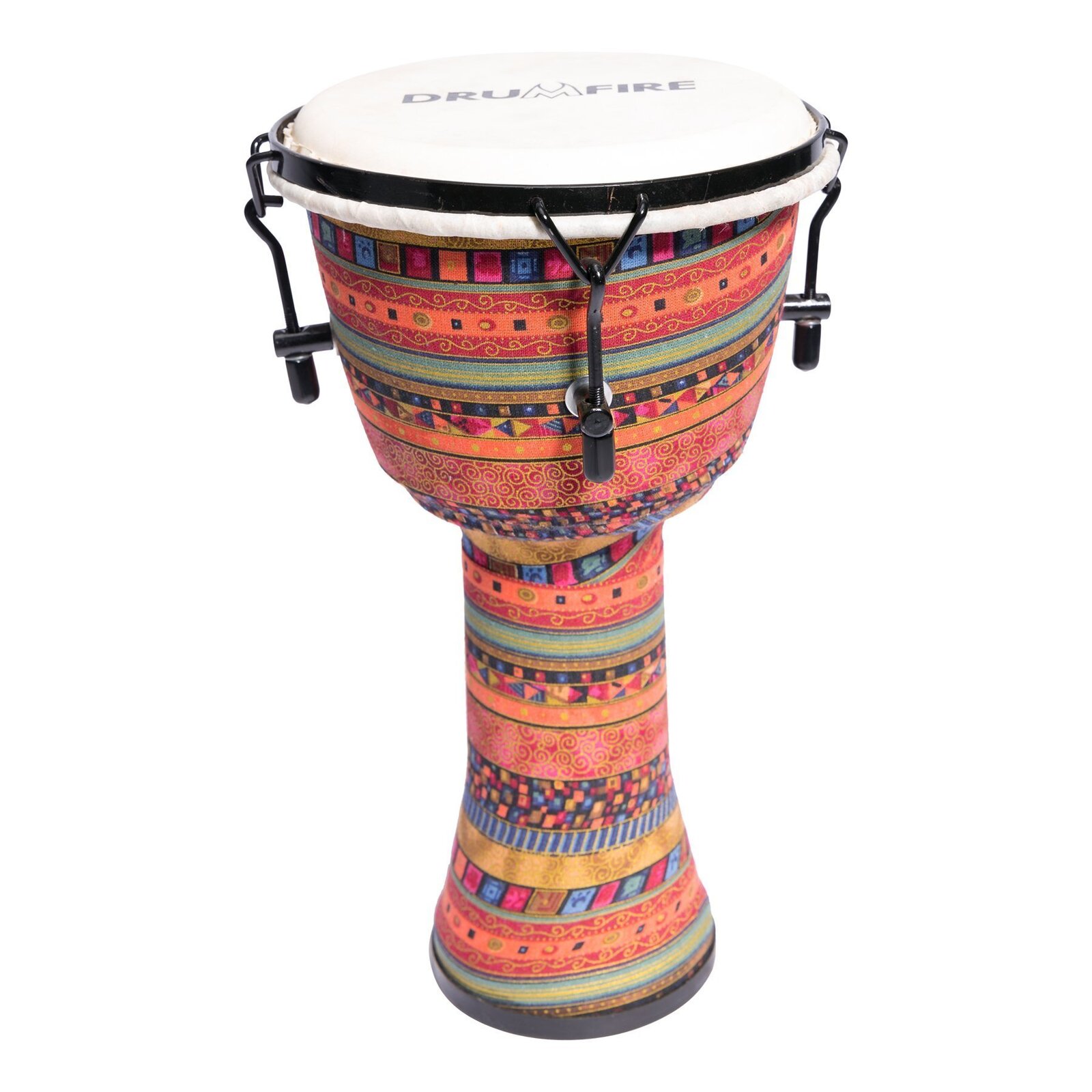 The Drumfire natural hide 8" tuneable djemebe features a synthetic shell with fabric wrap, tuneable lugs, rubber lined base and natural hide head; resulting in a djembe that sounds as good as it looks, with durability to match.