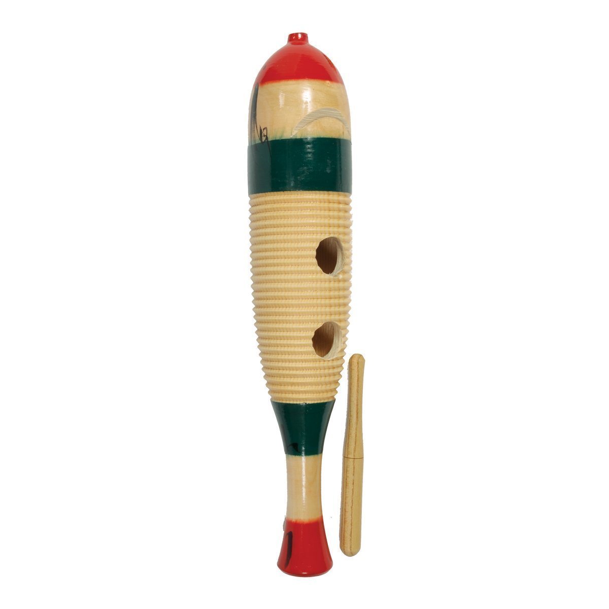 This guiro can be held by either the two finger holes or the neck, and comes complete with wooden striker.
