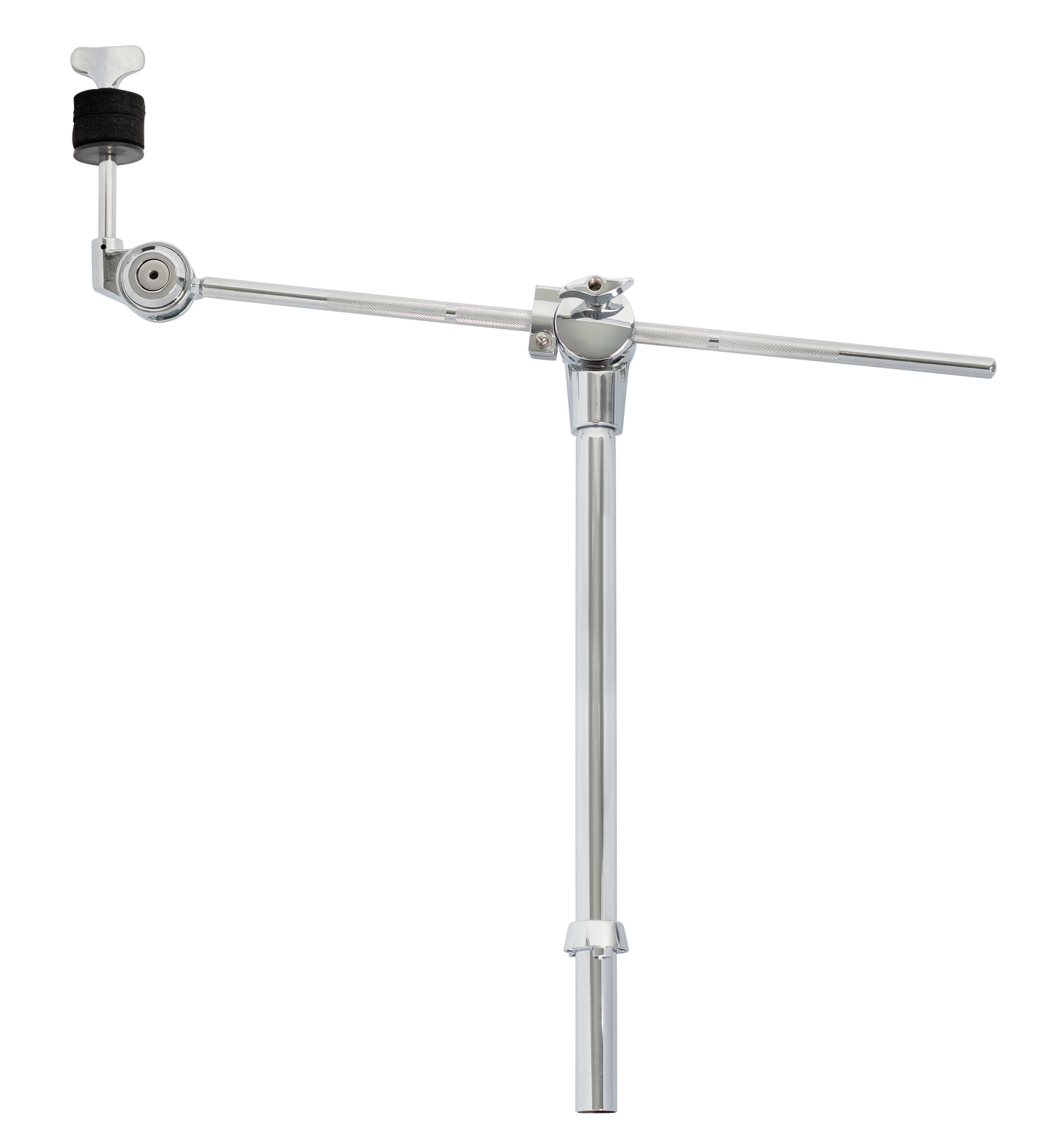 Knurled boom arm for secure locking with memory lock. Boom arm can be hidden down main mast for use as a straight cymbal holder. Tube with memory lock. Boom arm with memory lock. 360 degree adjustable cymbal tilter with cymbal isolation sleeve.