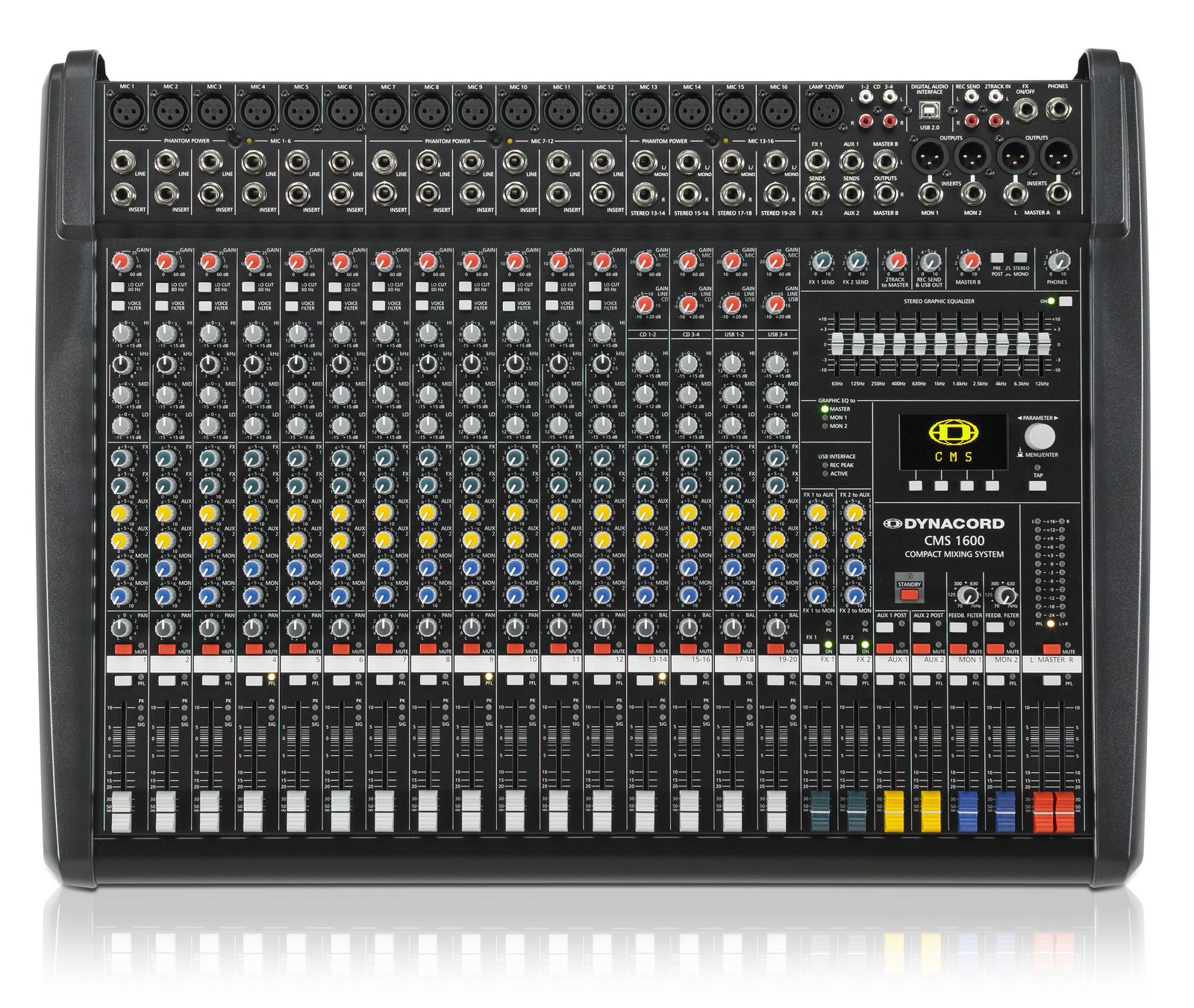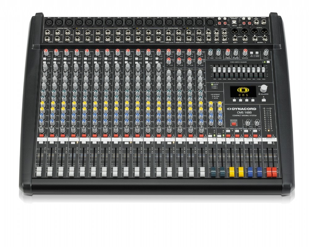 Dynacord CMS 1600-3 Features: 12x mic/line inputs in addition to 4x Mic/stereo inputs 3-band EQ with para. Mids and voicing channel 6 AUX channels Mute and PFL capacity 7-band EQ in total XLR output lamp terminal (4-pin XLR.) USB interface for direct play or record