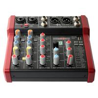 Compact audio mixer with options for 2 mono + 2 Stereo input channels, plus a minijack stereo input. Each mono channel has a combo XLR/jack input with switchable +48V phantom power in pairs for XLR inputs.