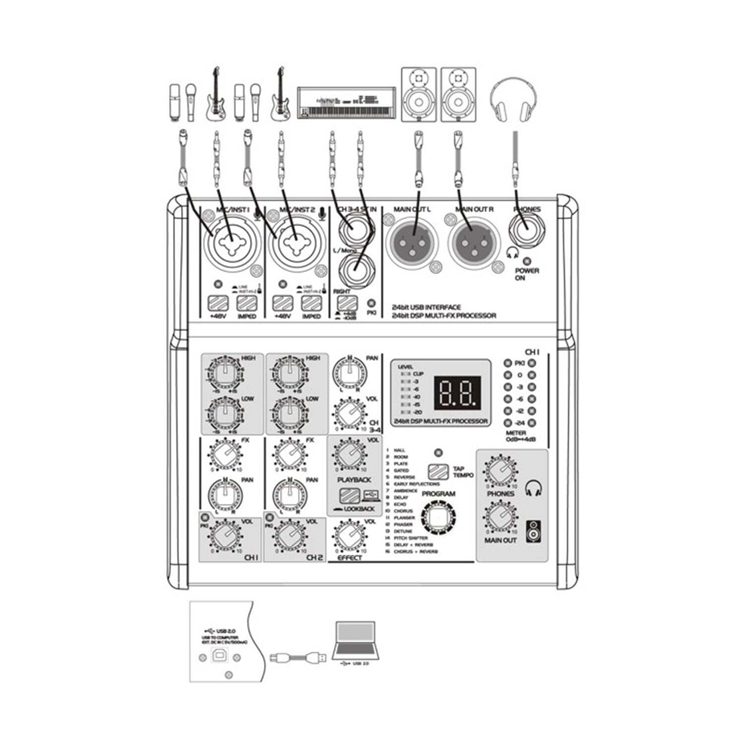 - Built-in 24 bit multi-digital effect processor, supports up to 16 kinds of effects to meet different requirements of your vocal or musical instruments.