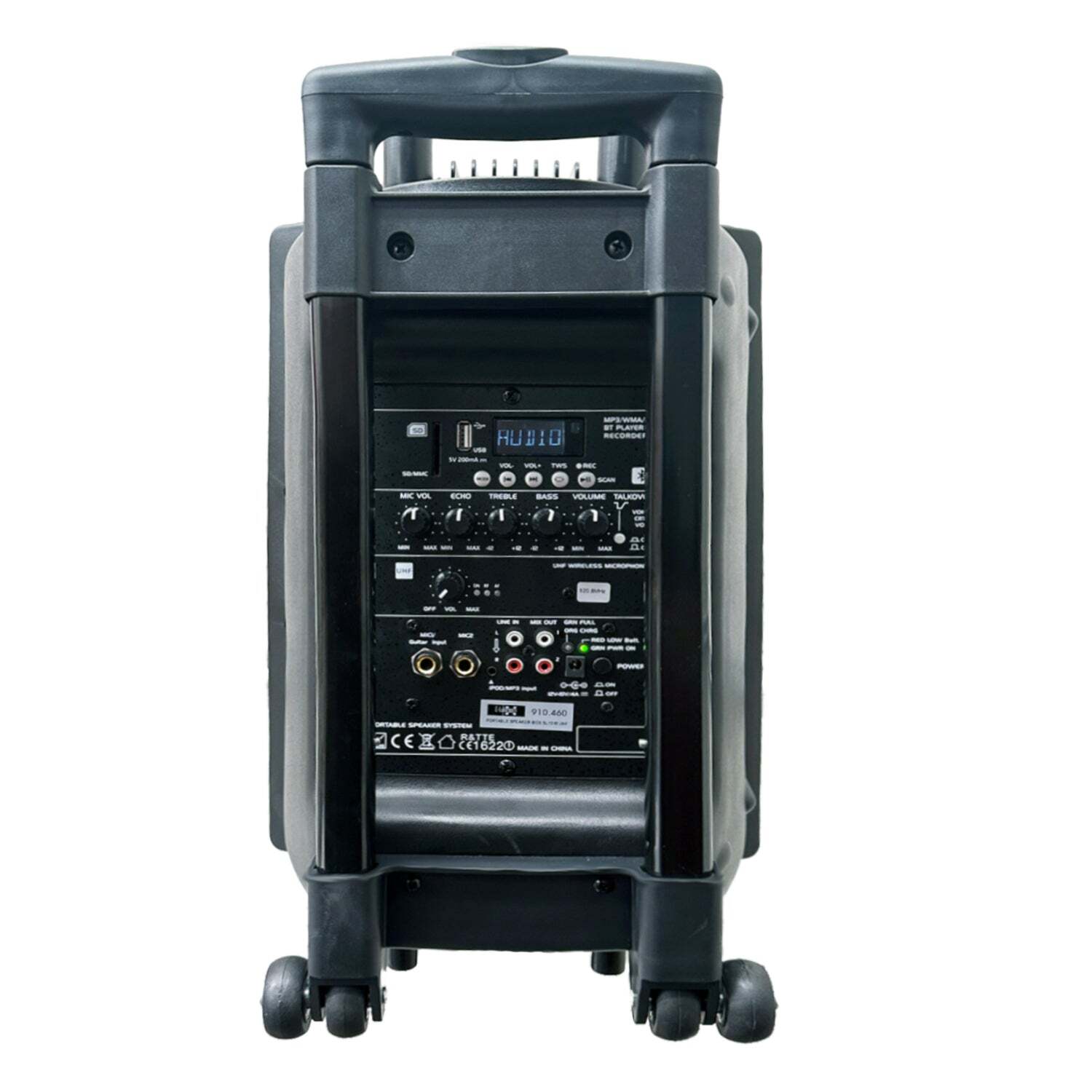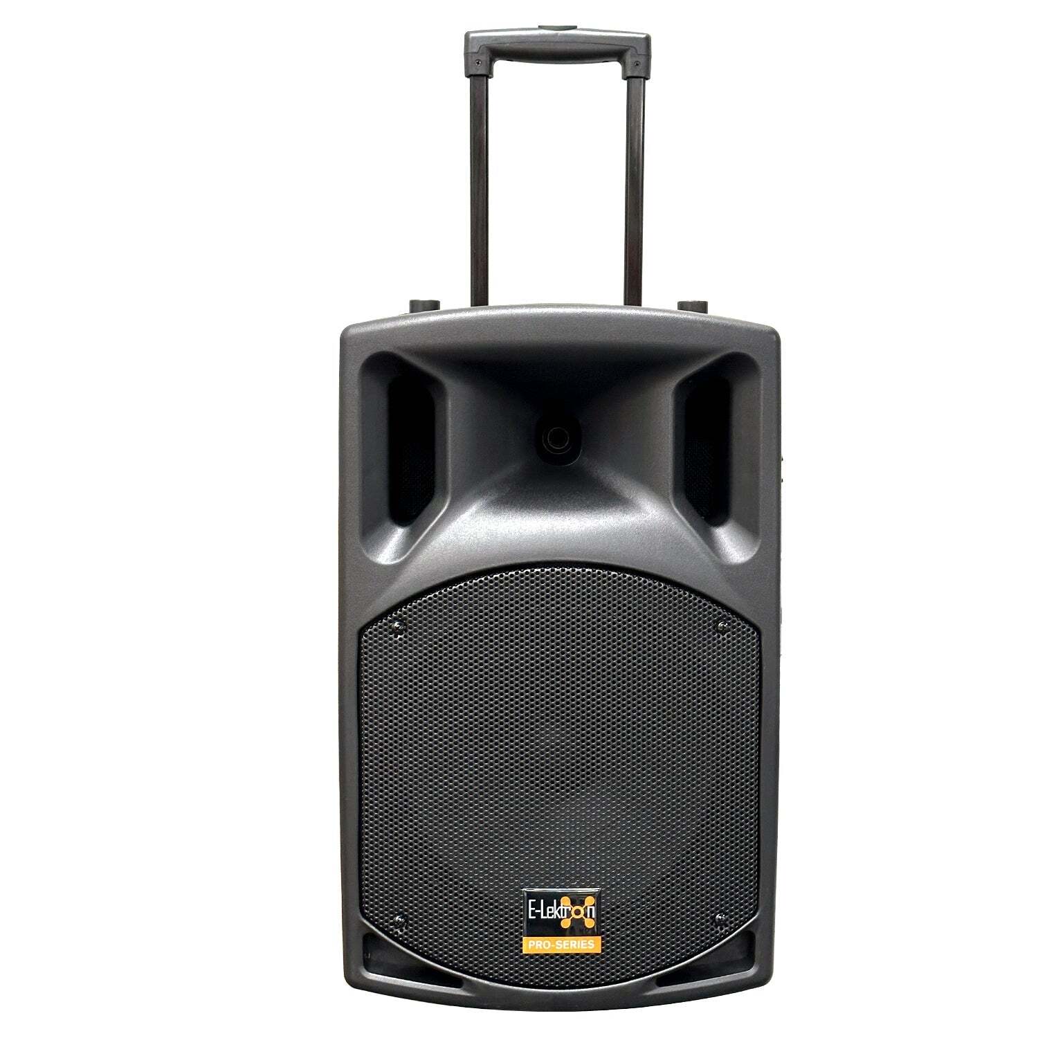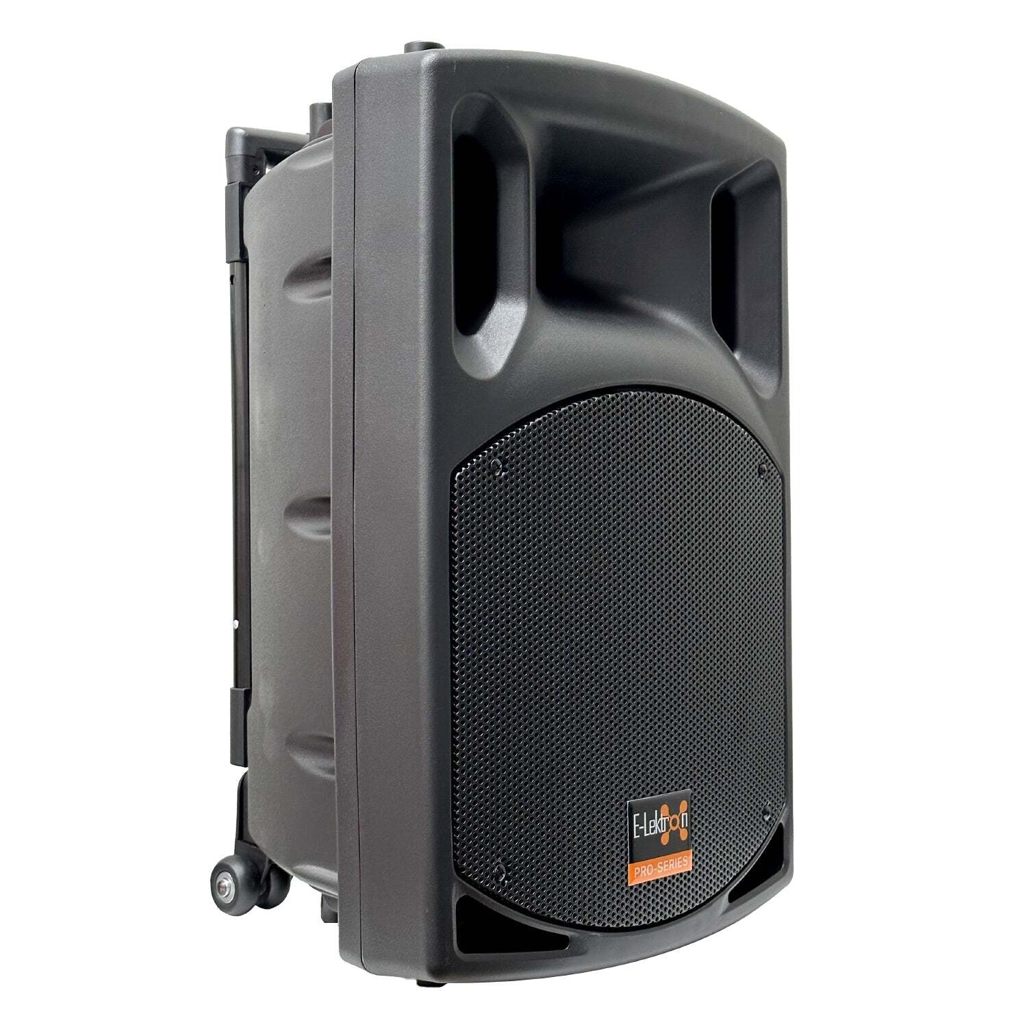 E-Lektron 10-inch portable speaker with UHF mic is a light Compact, only 46cm high and 10kg, 2-way sound system with a built-in power amplifier in shock-proof ABS plastic housing with handle and wheels.