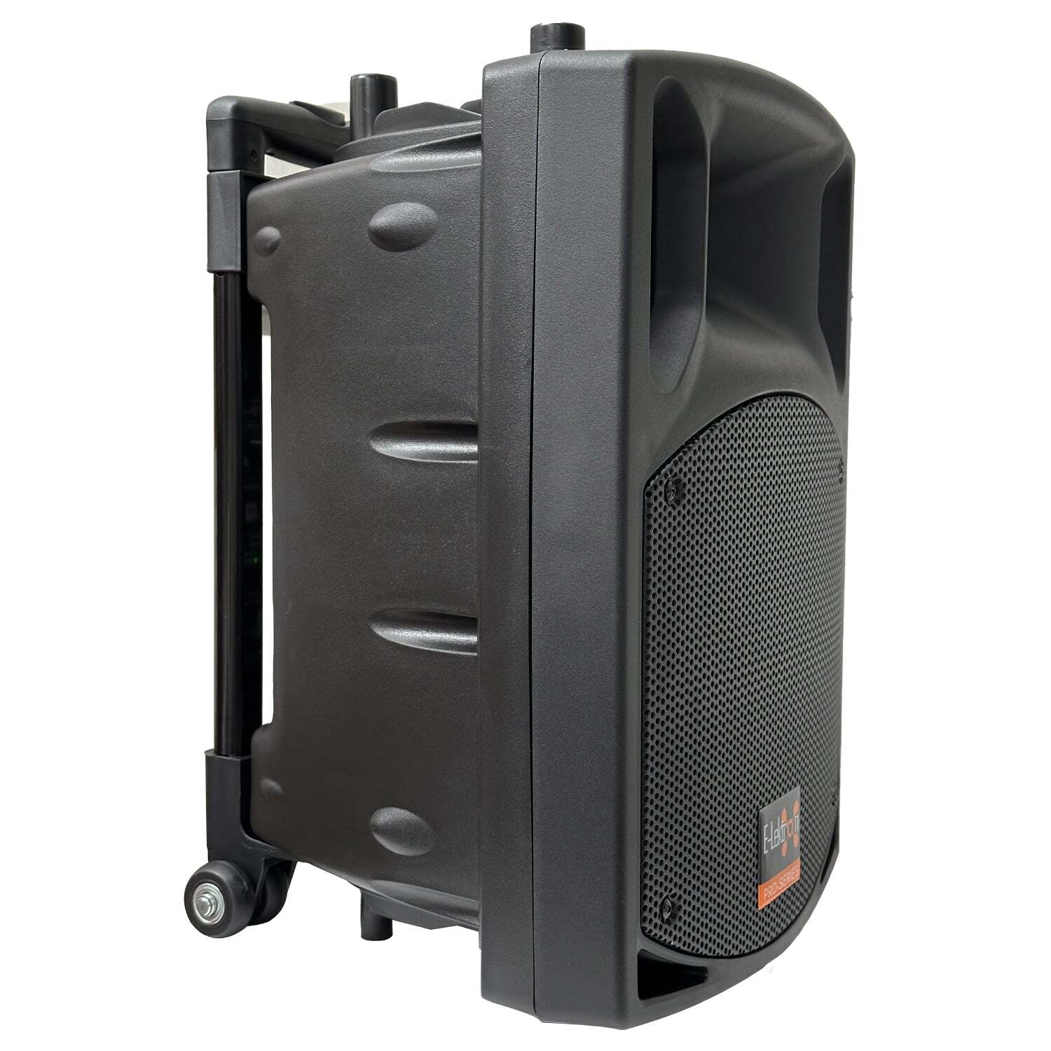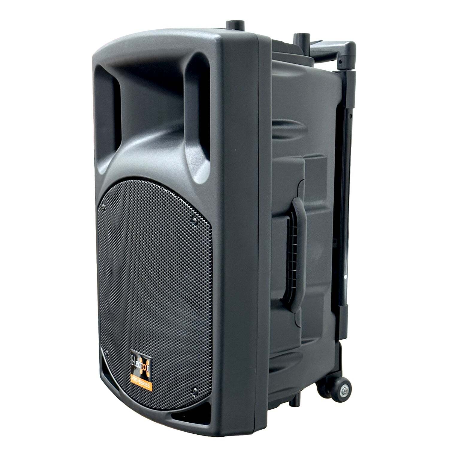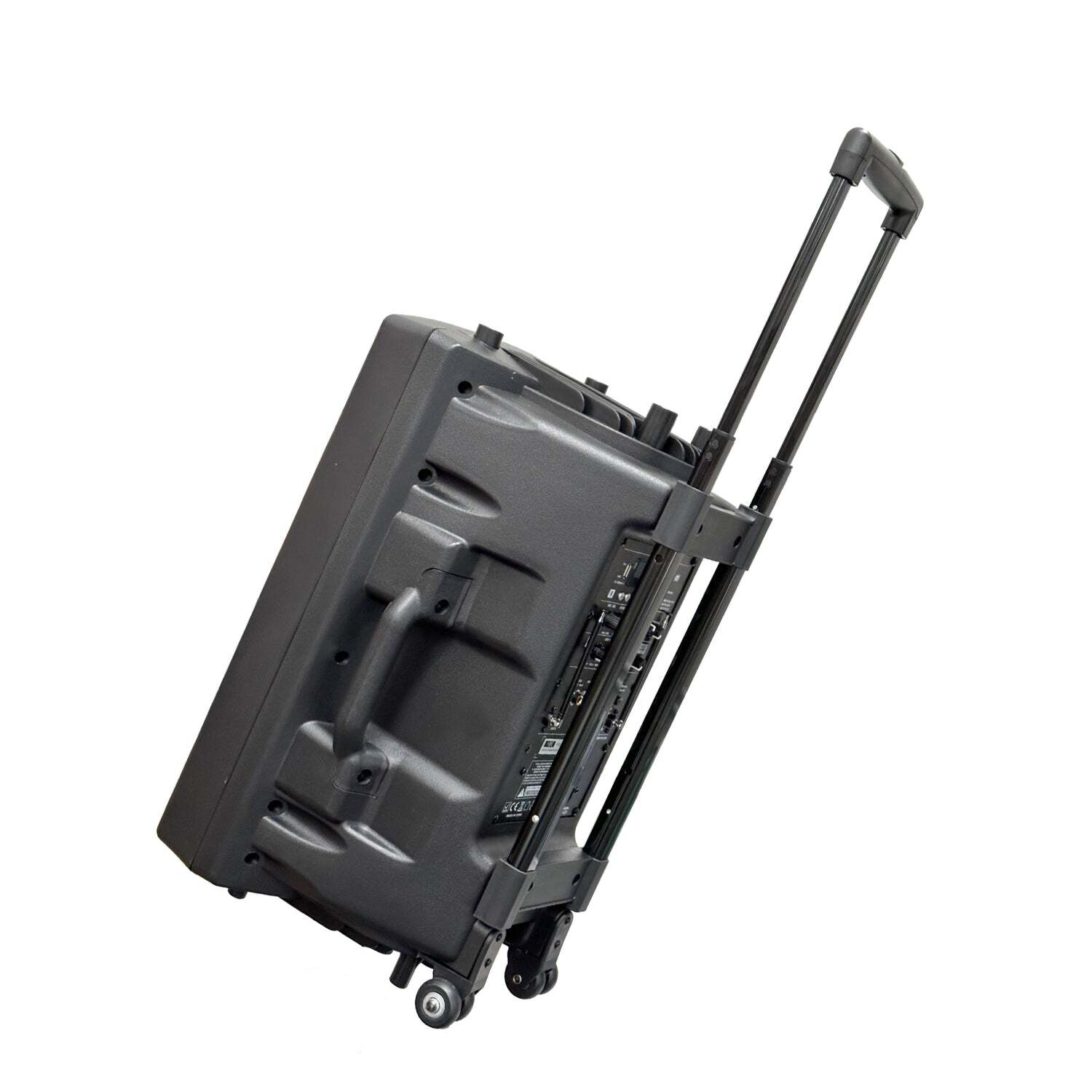 E-Lektron 10-inch portable speaker with UHF mic is a light Compact, only 46cm high and 10kg, 2-way sound system with a built-in power amplifier in shock-proof ABS plastic housing with handle and wheels.