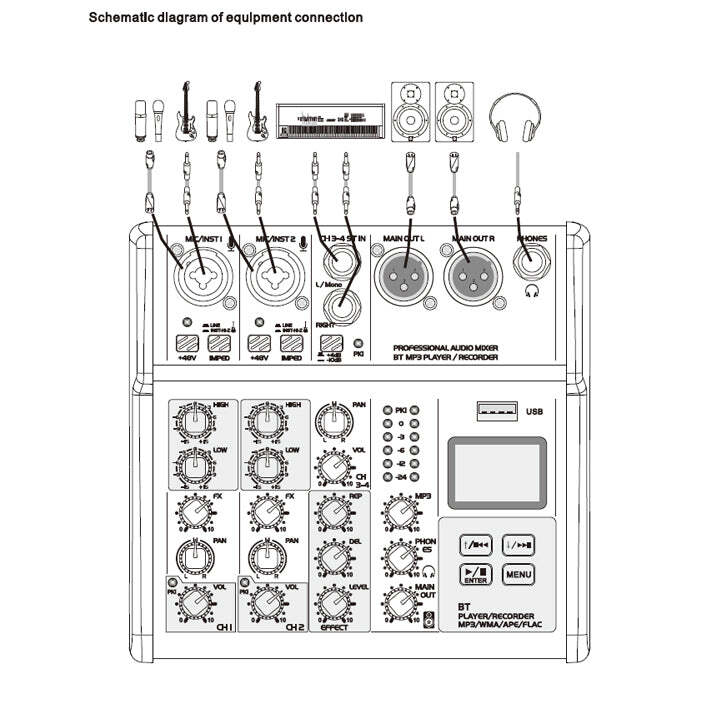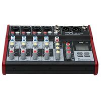 Compact mixer with 4 microphone/instrument channels, stereo channel and stereo USB / Bluetooth channel. Fully equipped with MP3 player/recorder, sound card, Bluetooth, reverb effect and phantom power.