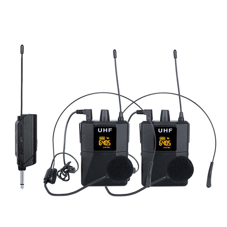 - Wireless UHF microphone set with 2 bodypack headset microphones