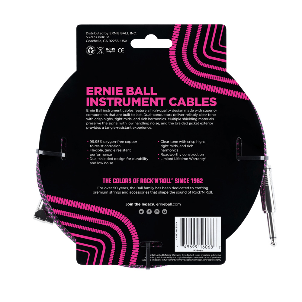 Ernie Ball 25 Feet Braided Straight / Angle Inst Cables feature a high-quality design made with superior components that are built to last. Dual-conductors deliver reliably clear tone with crisp highs, tight mids and rich harmonics. Multiple shielding materials preserve the signal with low handling noise and the braided jacket exterior provides a tangle-resistant experience. Cable length 25 feet (7.62m). Available in black/purple colour.