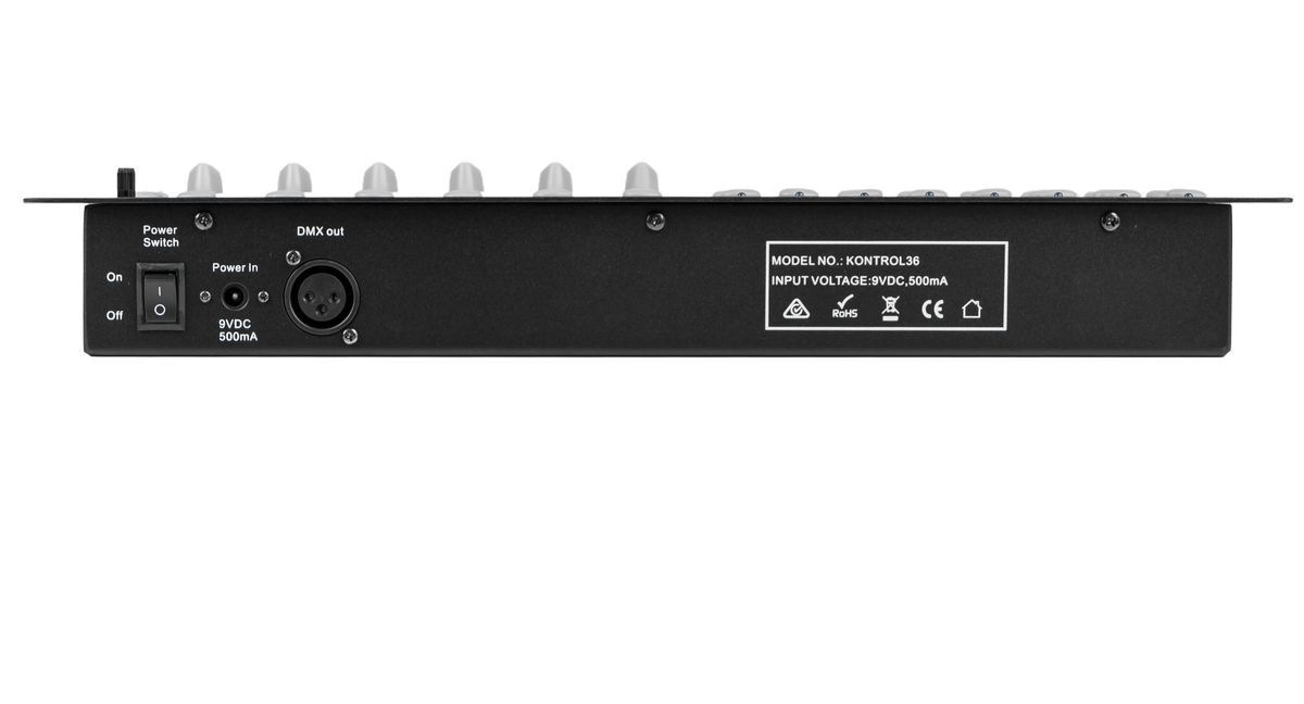 The KONTROL36 is a compact DMX controller designed for independent control of up to six RGBWAU fixtures, with each light able to be set in different playback modes simultaneously. It has some useful professional features including a virtual colour wheel with selectable macros, auto colour changing and strobe. KONTROL36 has multiple colour pre-sets allowing you to select from 18 buttons. You can use the controller manually, in sound active or fixture chase mode with adjustable black out.