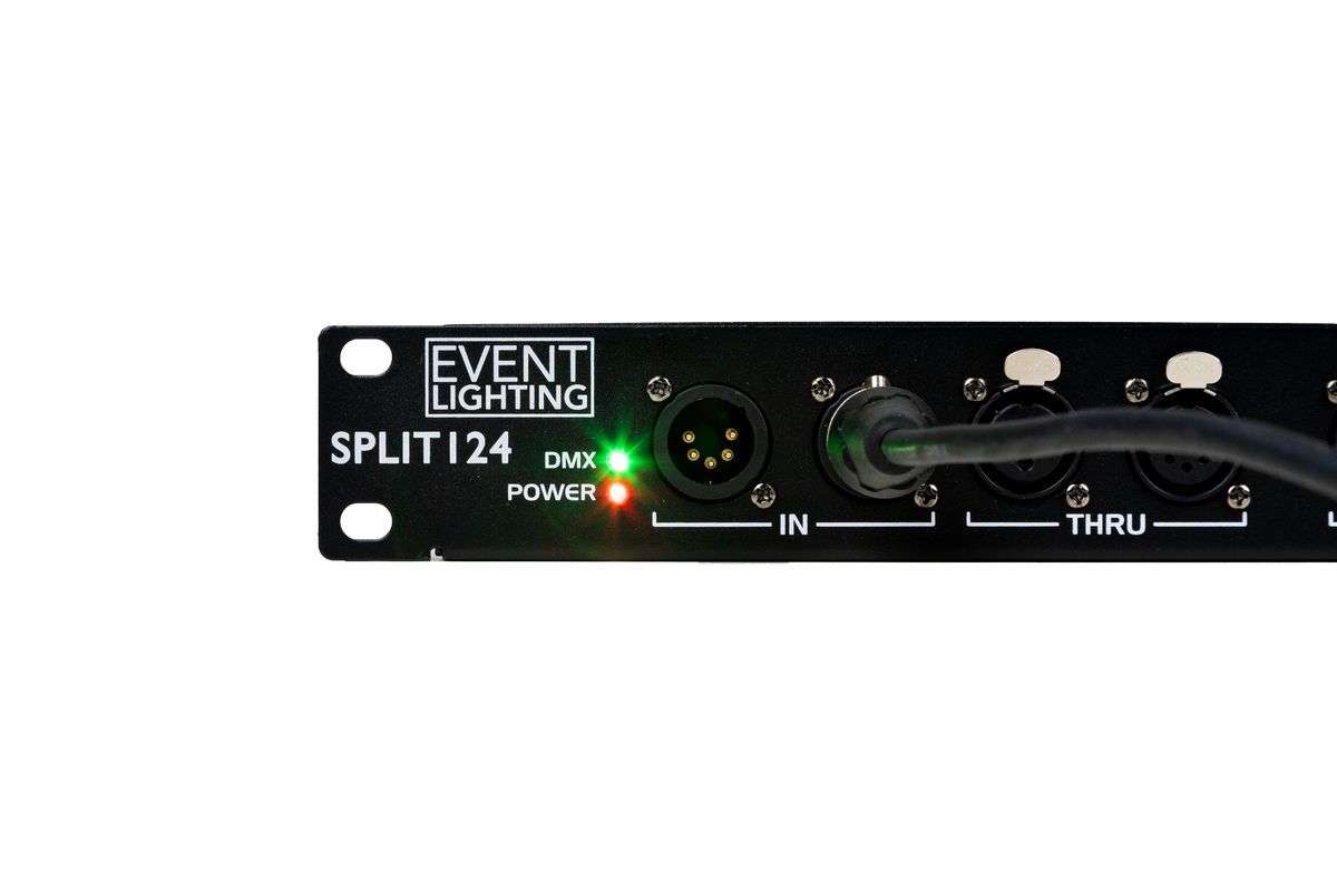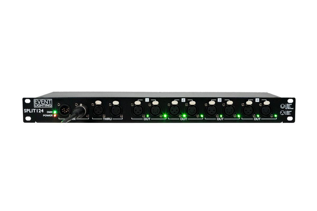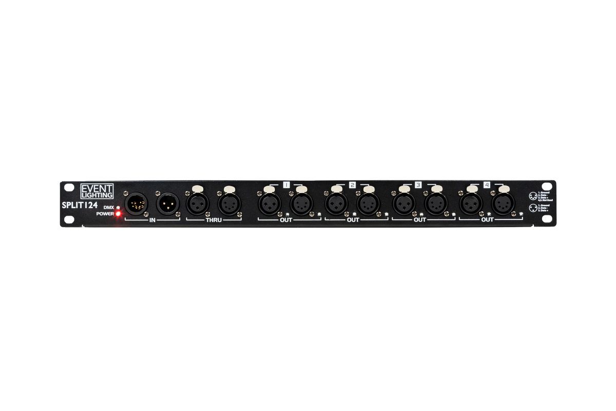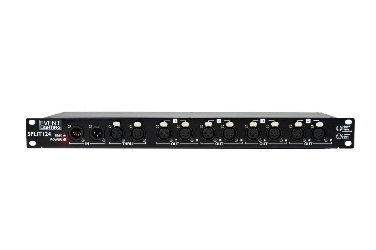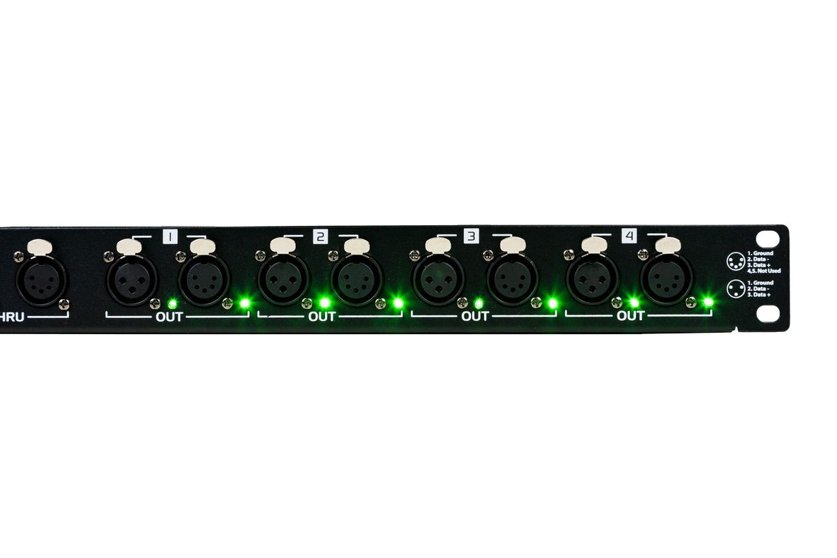 SPLIT124 - 1 In and 4 Out and 1 Through - Optical DMX splitter, both 5 and 3 pin XLR on all I/O, rack mountable