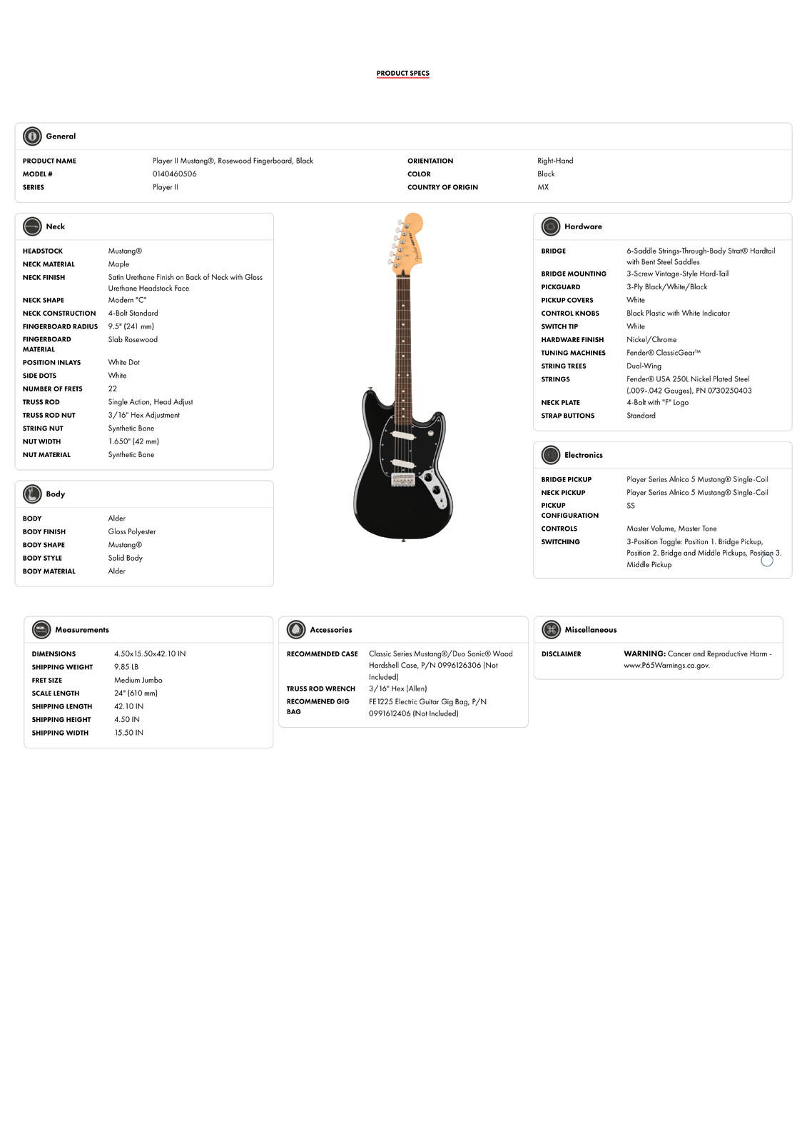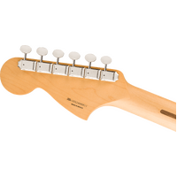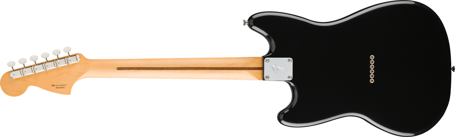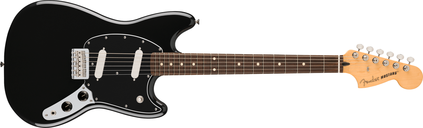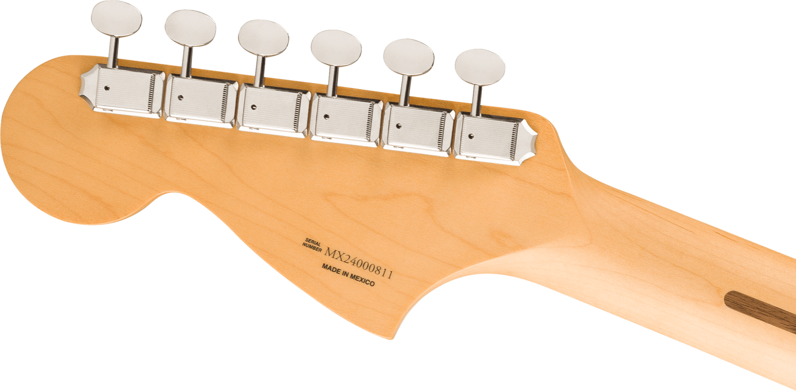 Alder Body Modern "C" Neck Profile 9.5-Radius Maple or Rosewood Fingerboard with Rolled Edges Player Series Alnico V Single-Coil Mustang® Pickups 6-Saddle Strings-Through-Body Strat®-Style Hardtail Bridge with Bent Steel Saddles ClassicGear Tuning Machines