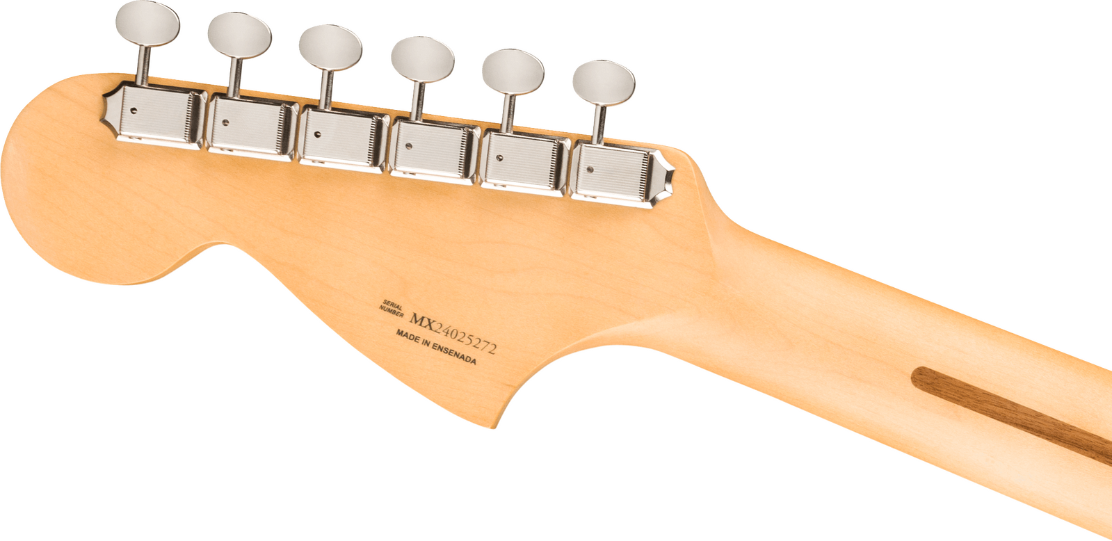 Alder Body Modern "C" Neck Profile 9.5-Radius Maple or Rosewood Fingerboard with Rolled Edges Player Series Alnico V Single-Coil Mustang® Pickups 6-Saddle Strings-Through-Body Strat®-Style Hardtail Bridge with Bent Steel Saddles ClassicGear Tuning Machines