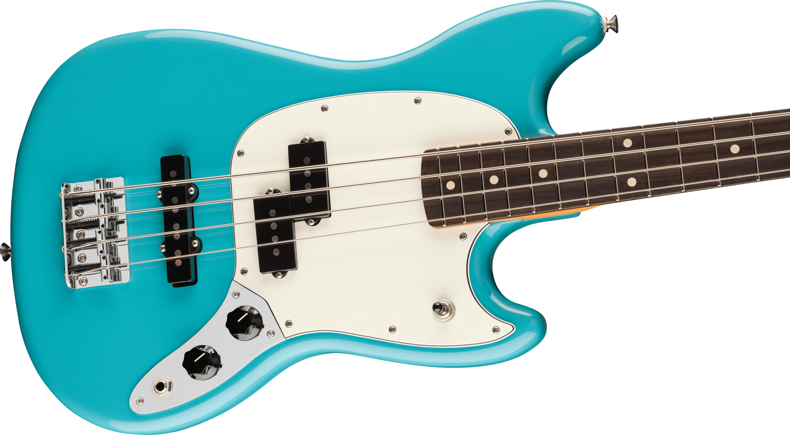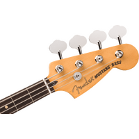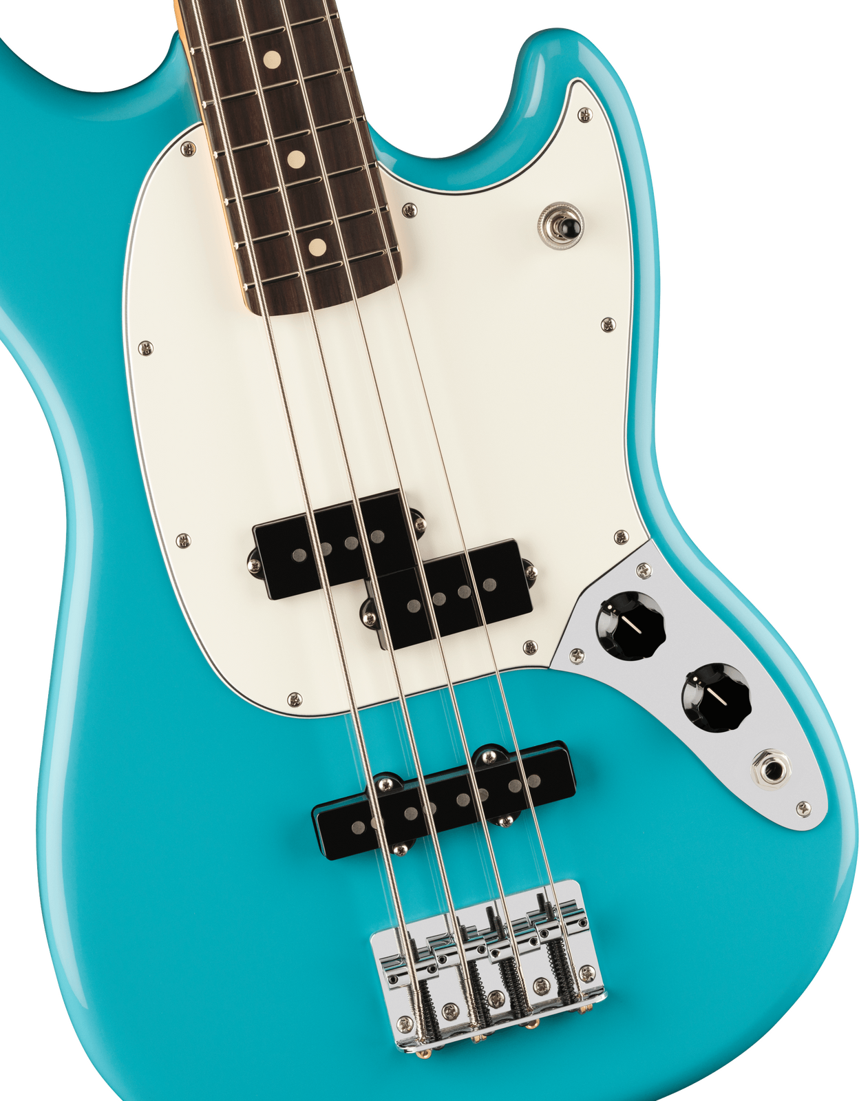 The Player II Mustang® Bass PJ radiates timeless Fender charm, but under the hood, it's primed for today's players. Everything about the neck is designed for fast and fluid playability, from the Modern C-profile with silky satin urethane finish on the back to the comfy 9.5-radius slab rosewood or maple fingerboard with smooth rolled edges and 20 medium jumbo frets. A classic alder body is available in both timeless Fender finishes and never-before-seen colors unearthed from the archives. Player Series Alnico V Split-Coil P bass® and Single-Coil J bass® pickups offer sweet highs, growling mids and seismic lows that elevate any genre. The 3-way toggle switch lets you easily dial in everything this versatile pickup set has to offer, while an adjustable 4-saddle bridge, single-groove steel saddles and open-gear tuners ensure precise tuning stability for the flexibility to explore endless sonic possibilities.