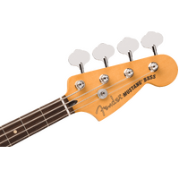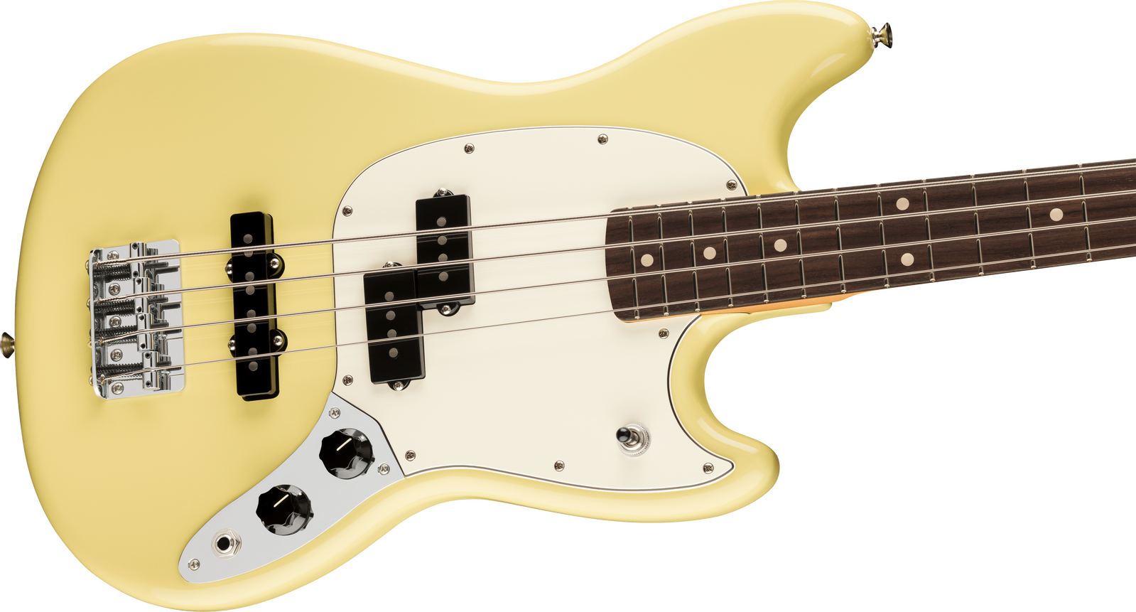 The Player II Mustang® Bass PJ radiates timeless Fender charm, but under the hood, it's primed for today's players. Everything about the neck is designed for fast and fluid playability, from the Modern C-profile with silky satin urethane finish on the back to the comfy 9.5-radius slab rosewood or maple fingerboard with smooth rolled edges and 20 medium jumbo frets. A classic alder body is available in both timeless Fender finishes and never-before-seen colors unearthed from the archives. Player Series Alnico V Split-Coil P bass® and Single-Coil J bass® pickups offer sweet highs, growling mids and seismic lows that elevate any genre. The 3-way toggle switch lets you easily dial in everything this versatile pickup set has to offer, while an adjustable 4-saddle bridge, single-groove steel saddles and open-gear tuners ensure precise tuning stability for the flexibility to explore endless sonic possibilities.
