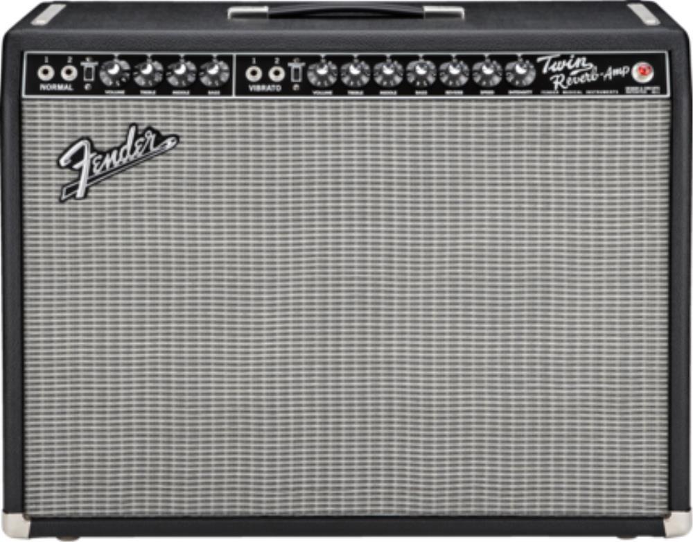The 85-watt (at 4 ohms) reissue ’65 Twin Reverb® features four 6L6 Groove Tubes® output tubes, four 12AX7 preamp tubes, two 12AT7 preamp tubes, two 12” 8-ohm Jensen® C-12K speakers, dual channels (normal and vibrato), Fender® reverb, vibrato, two-button reverb and vibrato on-off footswitch, tilt-back legs, black textured vinyl covering and silver grille cloth.