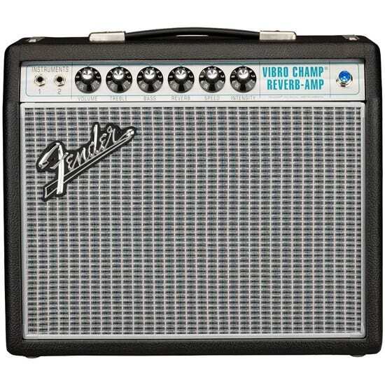 At just 5 watts, the original Vibro Champ® was famous for classic Fender tremolo, tube sparkle and killer grind at a reasonable level. The ’68 Custom Vibro Champ Reverb improves on this classic amp by adding a hall reverb and using a larger 10” speaker for increased low end. These additions make this little wonder perfect for rehearsal, home recording and even small gigs. Amplifier comes with fitted cover. Optional 2-Button Vintage Style (P/N: 0994058000) available.