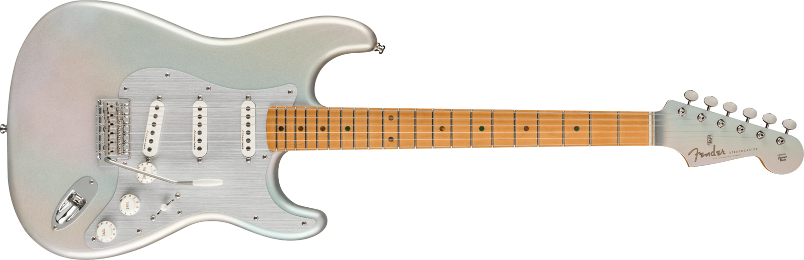 Dynamic R&B performer H.E.R. has wooed audiences and earned Grammys with her powerful performances and emotional songs – her smooth rhythms and slow-burning solos always at the forefront. The H.E.R. Stratocaster makes a statement as bold as the artist who inspired it. Finished in dazzling Chrome Glow and featuring a mid-‘60s “C” shape maple neck, Vintage Noiseless™ pickups and an anodized aluminum pickguard, this guitar delivers effortless playability, classic Strat® tone and extraordinary good looks.