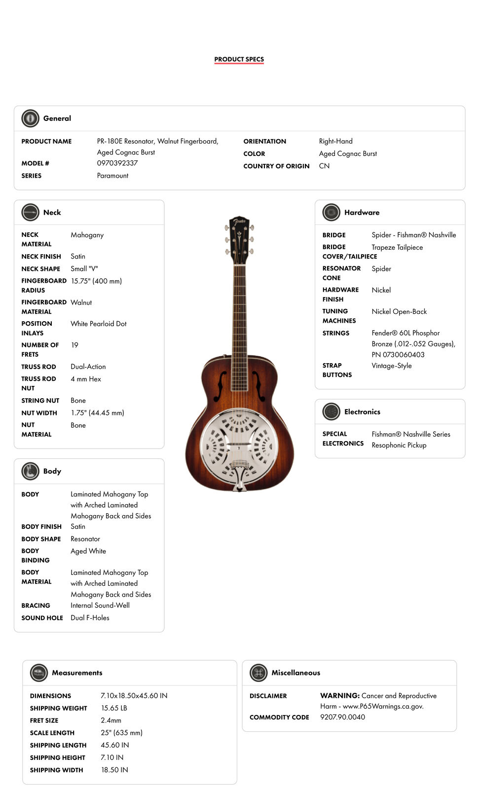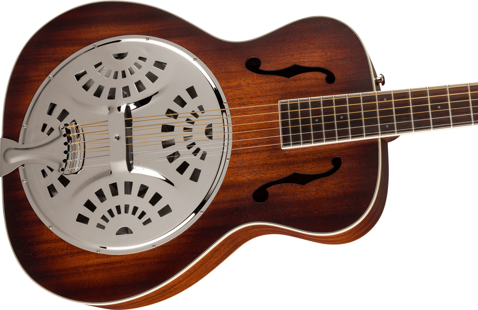 From Delta Blues to lap steel slide, the PR-180E round-neck resonator offers excellent versatility for traditional and modern music styles, with exemplary acoustic and amplified tone. The all-mahogany construction creates the perfect sonic balance between warmth and clarity for fingerstyle play, while the spider resonating cone provides superior sustain for the quintessential bluegrass sound. Long-favored by top resonator artists, the PR-180E is equipped with a Fishman® Nashville pickup system for the most accurate representation of its natural acoustic voice.