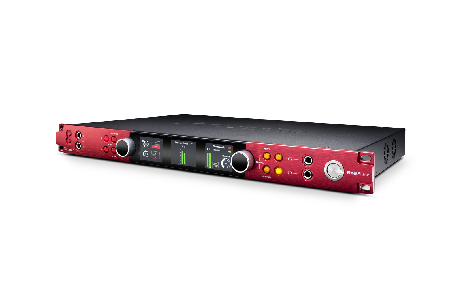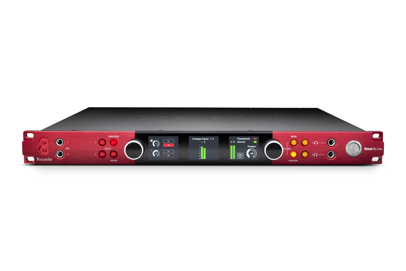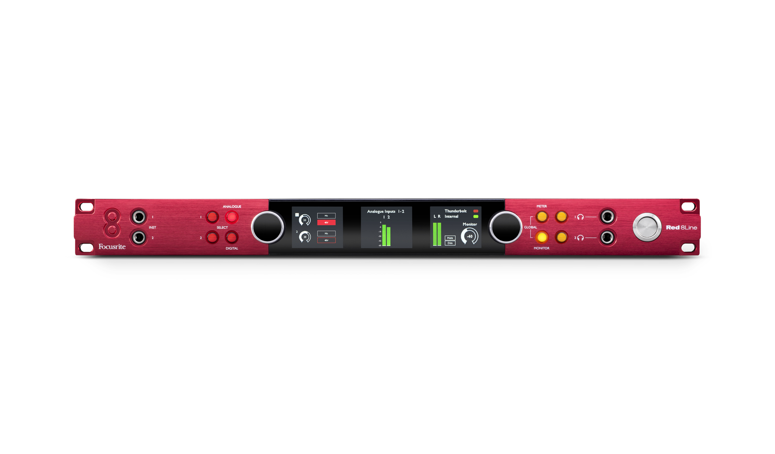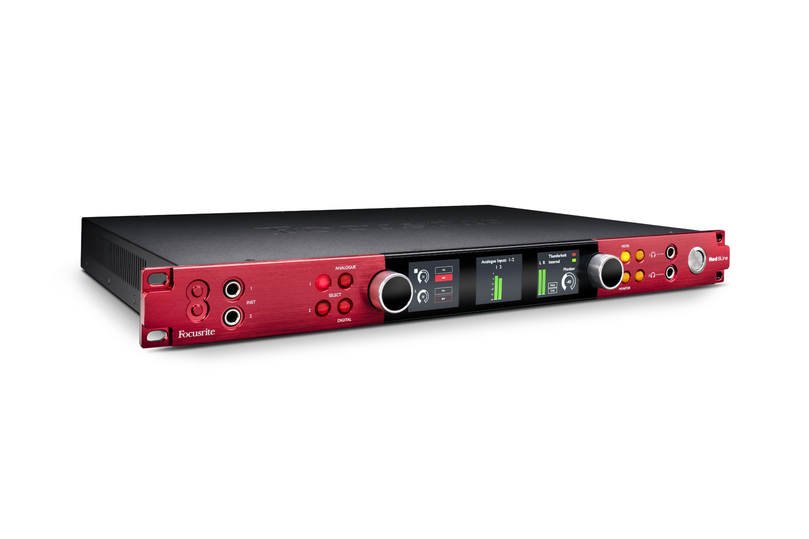 Other features of the Red 8Line include precision metering and display: the interface has three LCD displays for highly-accurate level metering for any input or output block, as well as main monitor and headphone outputs. Two discrete high-fidelity headphone outputs are powerful enough to deliver loud and clear audio on high-impedance headphones, and are controlled from the interface front panel. Dual instrument inputs on the front panel ensure you always have immediate access to quickly plug in a guitar, for example, even when racked.