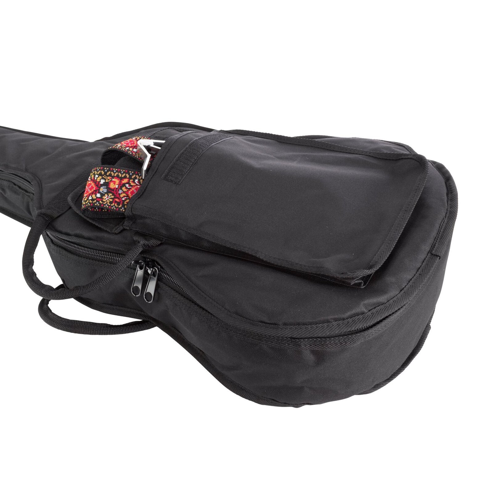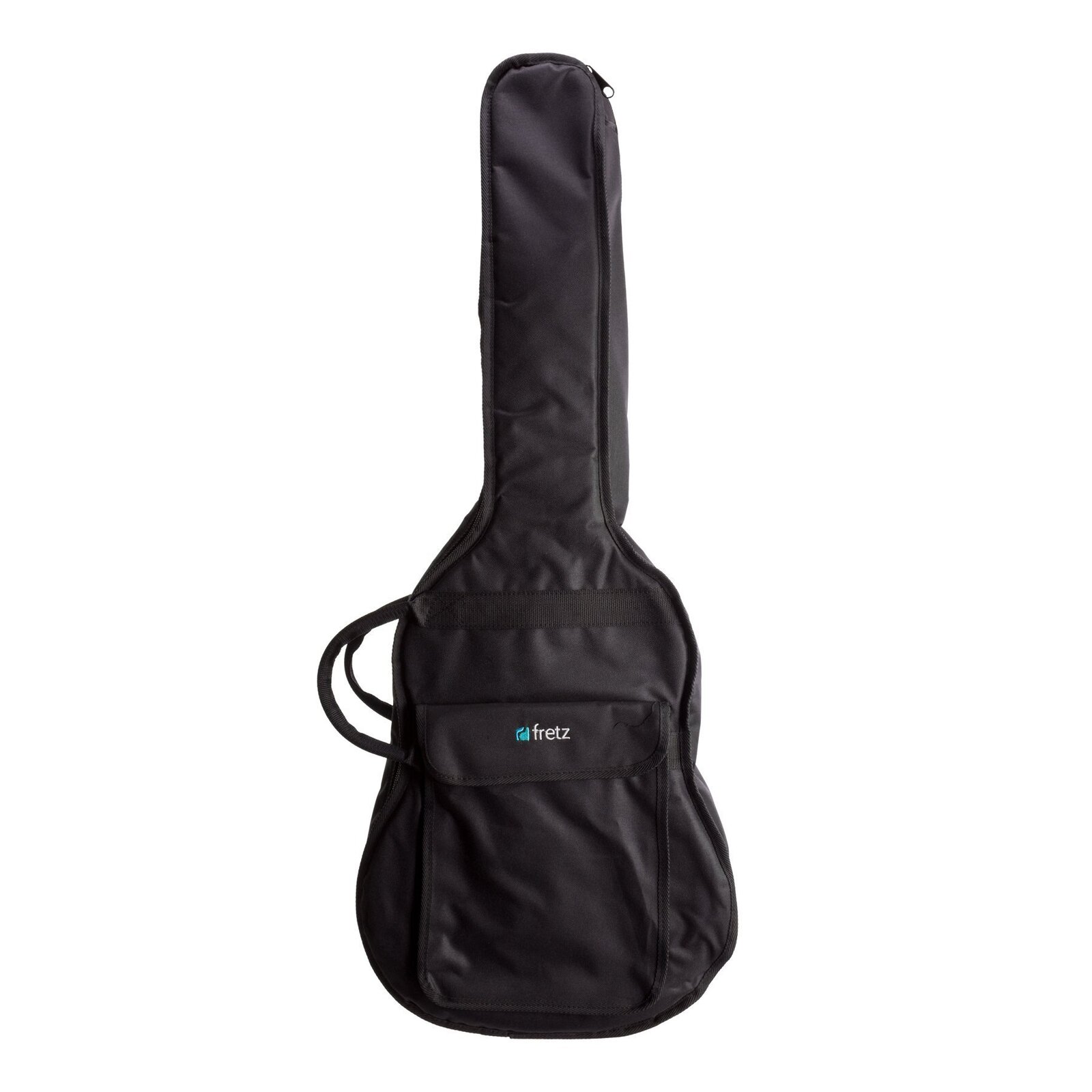The Fretz Deluxe Classical Guitar series gig bags are constructed of heavy duty polyester with 10mm thick rigid foam padding and feature tear resistant interior panels at the headstock and bridge, heavy duty zip, front accessories pocket, stitched carry handles and adjustable back straps with quick releases clips.