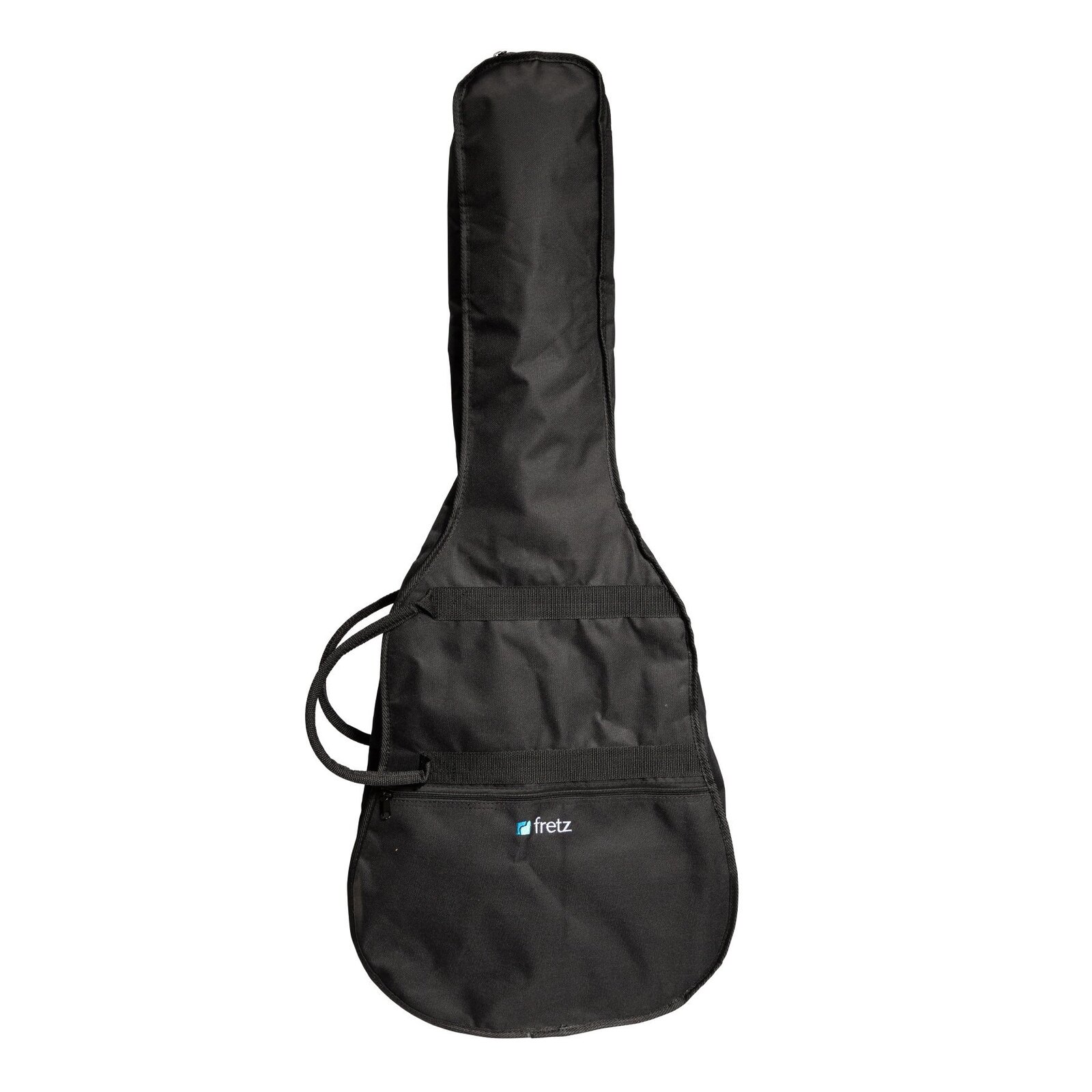 Fretz Heavy Duty Acoustic Guitar gig bags are constructed of heavy duty polyester with 4mm thick foam padding and feature tear resistant interior panels at the headstock and bridge, heavy duty zip, front accessories pocket, stitched carry handles and adjustable back straps with quick releases clips.