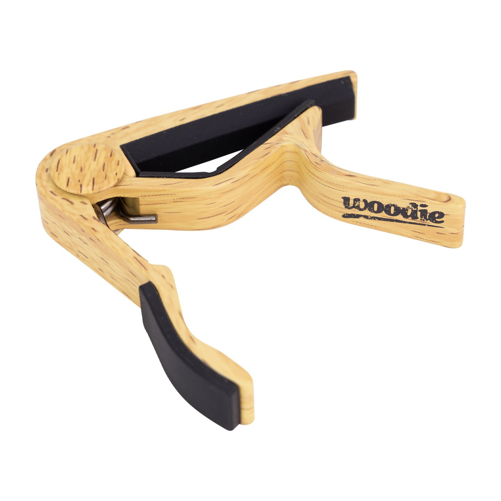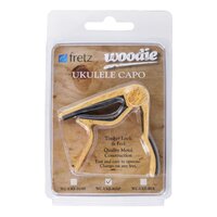The Fretz "Woodie" ukulele capo is suitable for a variety ukulele sizes and features trigger grip functionality for automatic tensioning, and protective rubber grips to prevent damage to your ukuleles neck and fretboard.