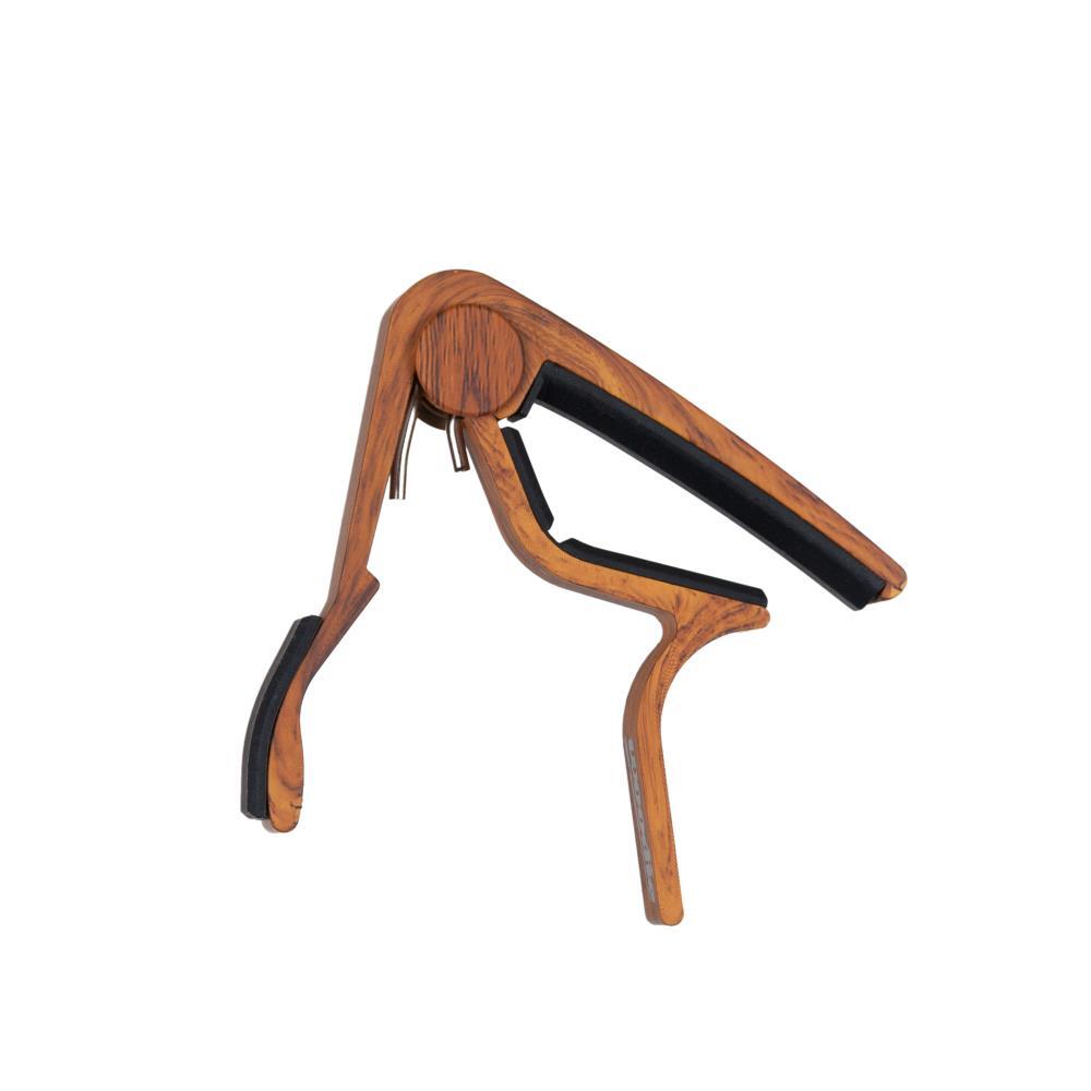 The Fretz 'Woodie' trigger grip capo is a stylish, unobtrusive and easy to use solution to quickly raising the pitch of your guitar.