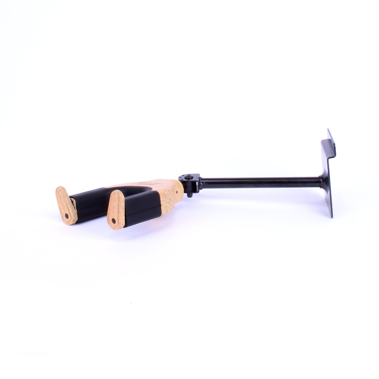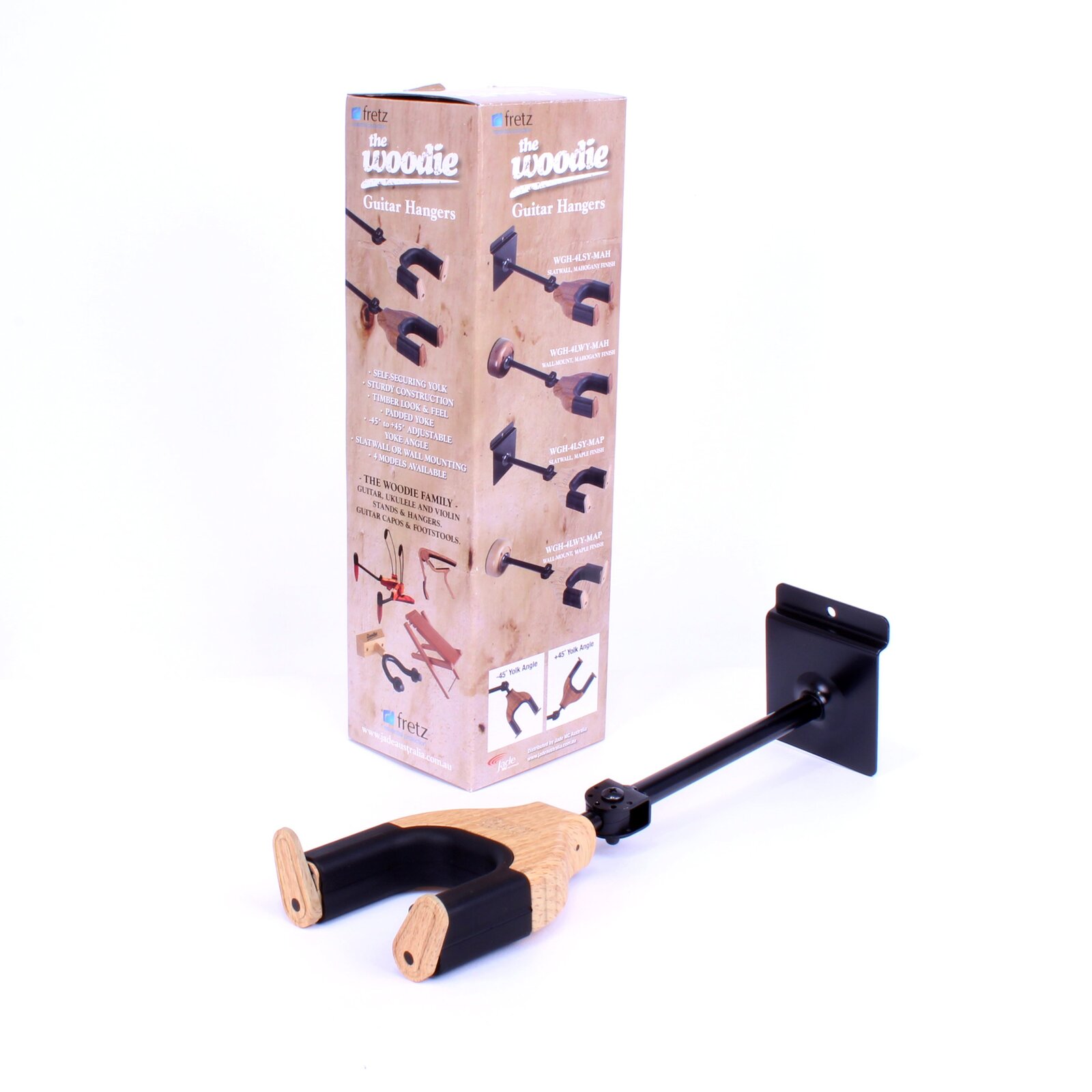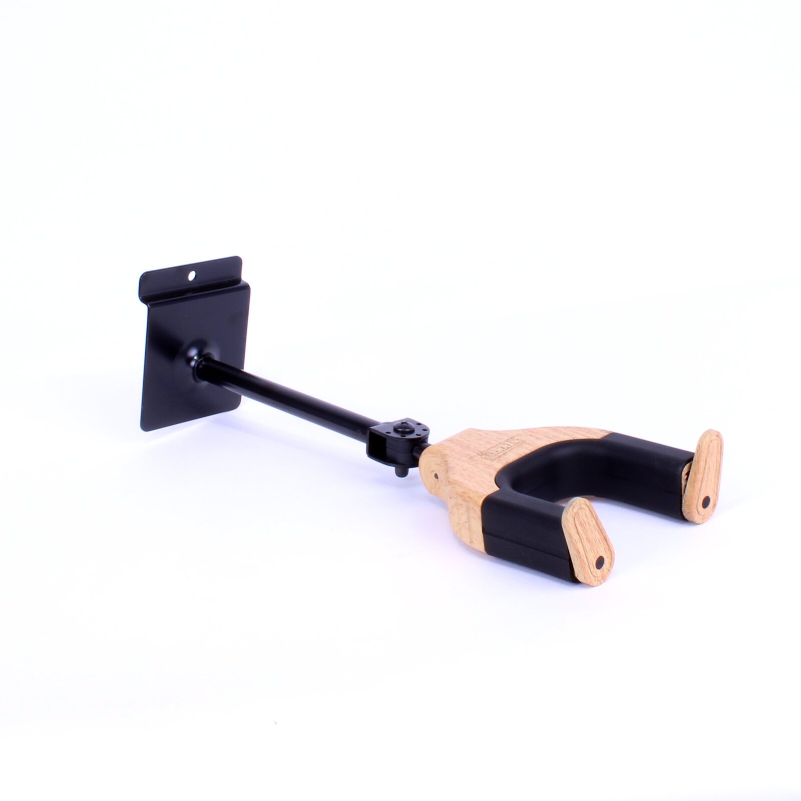 The Fretz 'Woodie' Long Self-Securing Slatwall Guitar Hanger features a protective rubber yoke support and adjustable long shaft for increased display flexibility.