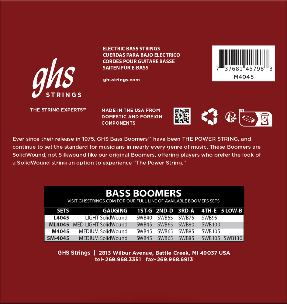 GHS Strings released Bass Boomers® in 1975 and altered the course of rock and roll! Winding a nickel-plated steel cover over a hex core, Bass Boomers® have a distinct low-mid bump that is aggressive and bold. Equally suited for pick or fingerstyle, the special recipe of stainless and nickel-plate on the low E and B strings keep your sound defined and strong. Hear why millions consider Bass Boomers® as THE POWER STRING.