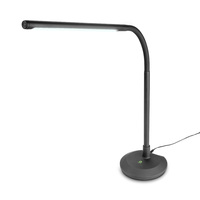 This ultra slim and elegant L-shape desk lamp with silicone coated gooseneck provides uniform illumination exactly where you need it. It features a strip of 18 LEDs that are switchable between warm or cool white (approx. 3,000/6,000 K), and the touch sensitive power button doubles as a stepless dimmer switch. The gooseneck section is easily flexible yet stays put where you bend it. The Gravity L-shape desk lamp integrates a convenience USB type A port for charging smart phones and tablets and comes with a 12V power adapter. It also makes a great piano lamp, workbench light or bedside reading lamp.