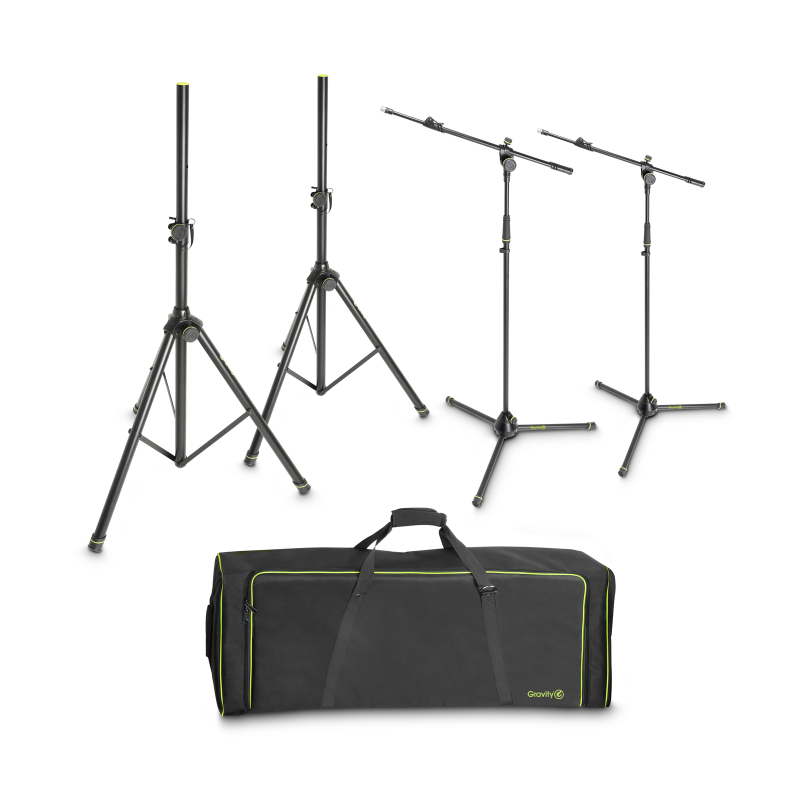 This set includes two Gravity GSP5211B tripod speaker stands and two GMS4322B microphone stands with folding tripod base and 2-Point adjustment telescoping boom in the padded heavy duty GBGSS2MS2B carry bag for convenient, easy transport.