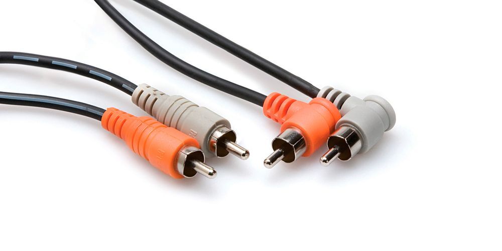Stereo Interconnect, Dual RCA to Dual Right-angle RCA, 2 m | Designed to interconnect gear with stereo phono jacks | Right-angle plugs on one end allow easy access to jacks with minimal clearance | Nickel-plated plugs for rugged durability and efficient signal transfer | Oxygen-Free Copper (OFC) conductors for enhanced signal clarity | OFC spiral shields for effective EMI and RFI rejection and flexibility | Lifetime warranty