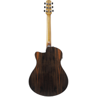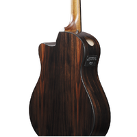 Macassar Ebony back and sides imbue this guitar with an exotic appearance. Macassar Ebony features full-bodied, deep lows and sparkling treble tones.