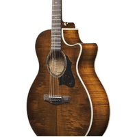 The attractive Flamed Okoume back and sides offer punchy and rich mid-range tones.