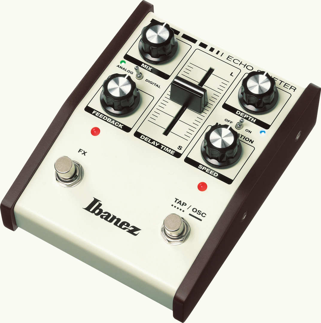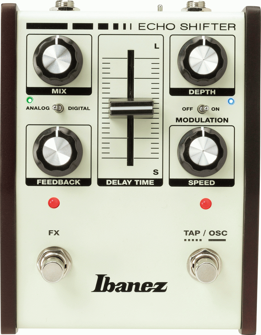 Ibanez is pleased to present the new ES3 Echo Shifter. The pedal is equipped with both analog and digital delay modes. The analog setting provides a warm, natural tone with a delay time of between 40ms and 600ms, and unlike other digital pedals which simply simulate analog delay, the ES3 is equipped with actual analog circuitry. The digital mode offers longer delay times all the way up to 1500ms. The ES3 is currently the only pedal on the market which provides the choice between true analog and digital delay in one pedal.