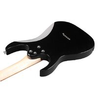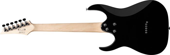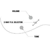 With the guitar held in the playing position, there is one knob and one switch along the lower edge of the body. Closest to the neck is the five-way pickup selector switch. Closer to the input jack is the tone knob. The volume knob is located right above the five-way pickup selector switch.