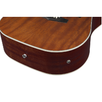 The Okoume back and sides generate a woody, warm tone when the guitar is played softly or finger-picked and provide punchy high-mids with a clear projection when strummed.